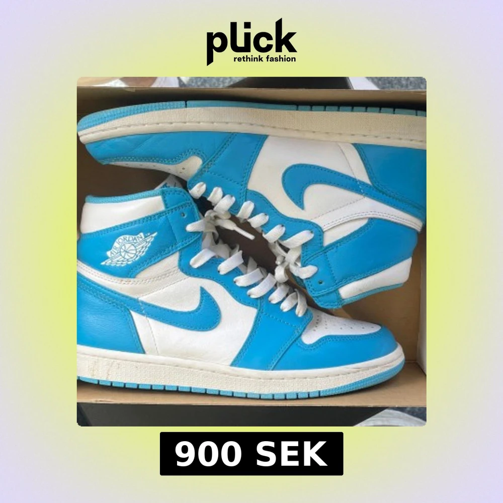 Säljer ett par Nike Air Jordan 1 i den ikoniska UNC-färgen. Skorna är höga sneakers i blått och vitt skinn med klassisk Air Jordan-logga på sidan, vit sula och blå yttersula. Perfekta för dig som vill sticka ut med en retro basketstil. Skorna är använda och därför går priset att diskutera.