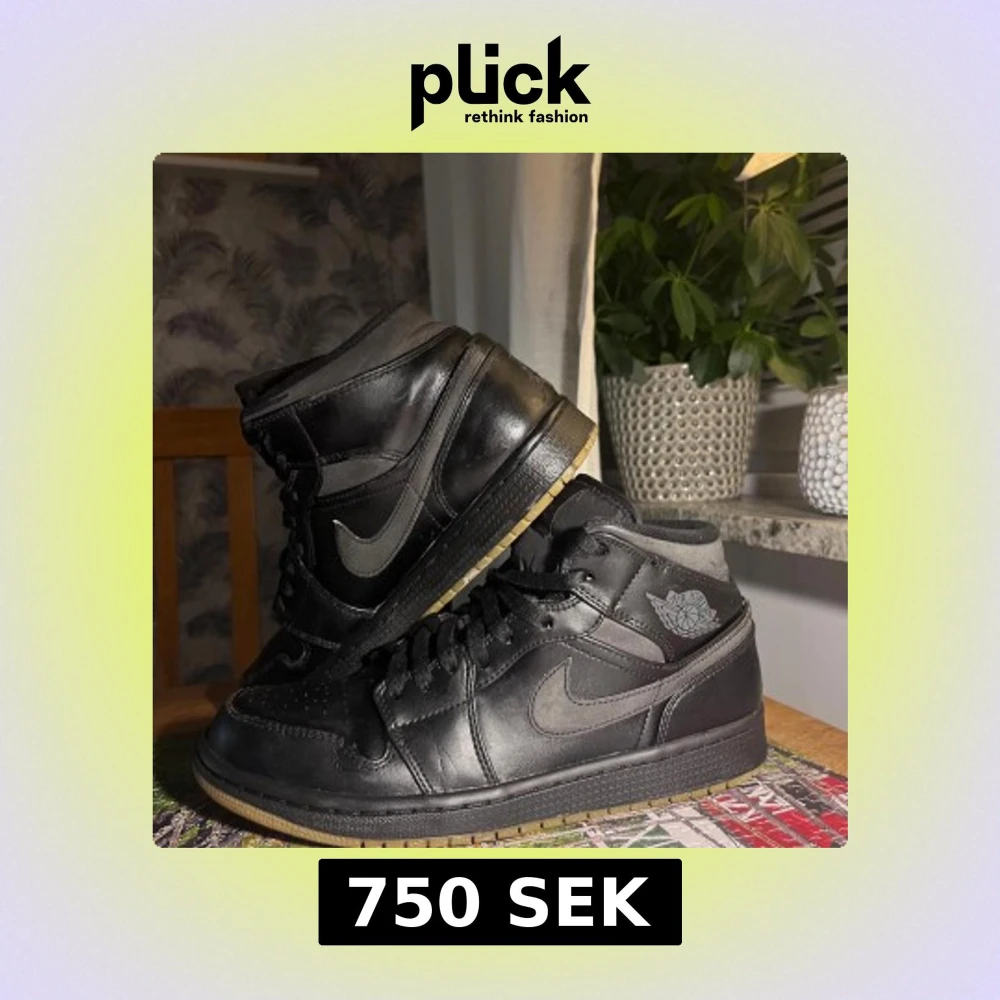 Svarta Nike Air Jordan 1 Mid i skinn med klassisk vinge-logga på sidan och svart swoosh. Hög modell med snörning och vadderad plös. Snygg gummisula med diskret kontrast. Perfekta för dig som gillar streetstyle och vill ha en ikonisk sneaker i garderoben. Finns skador men inte stora