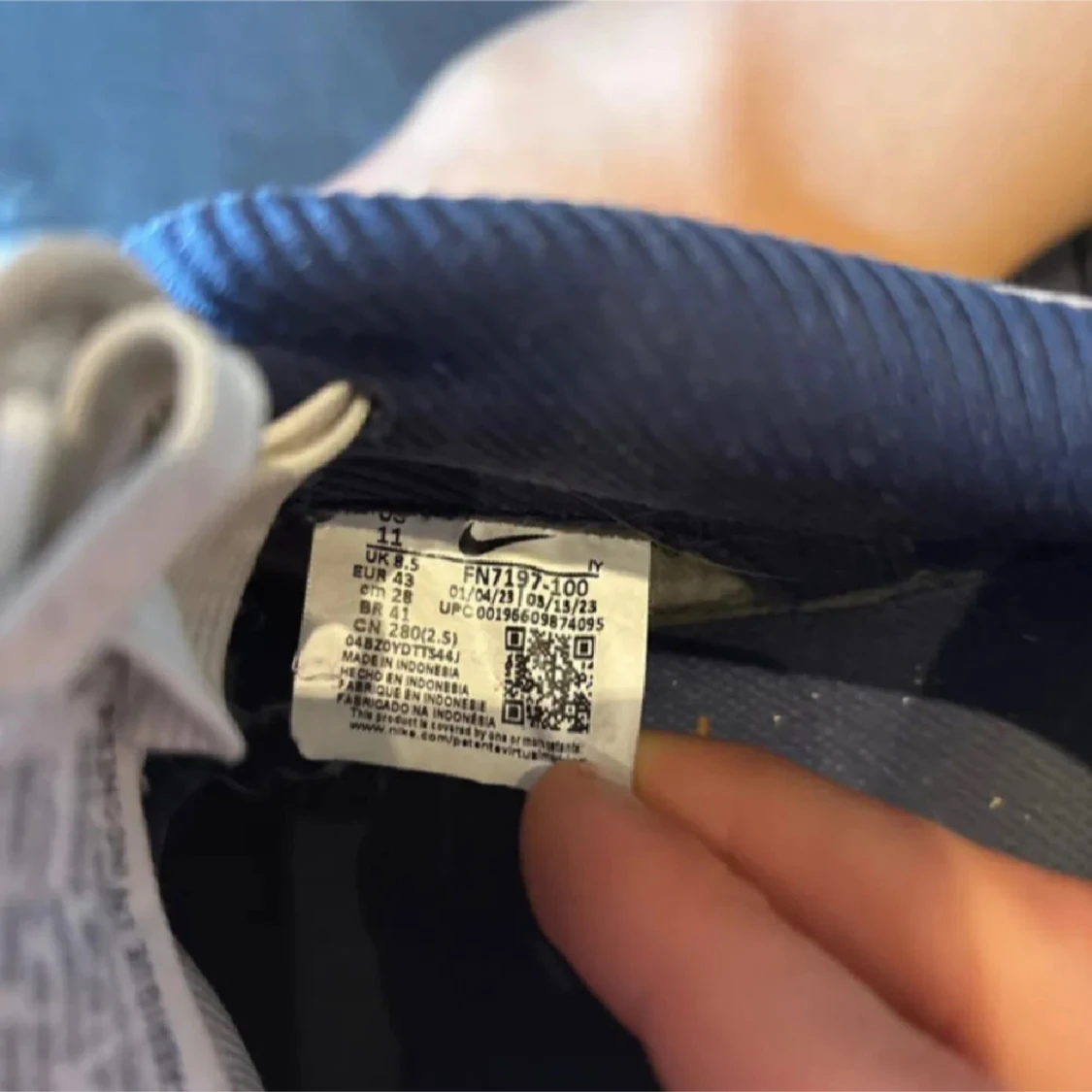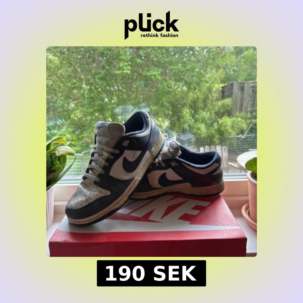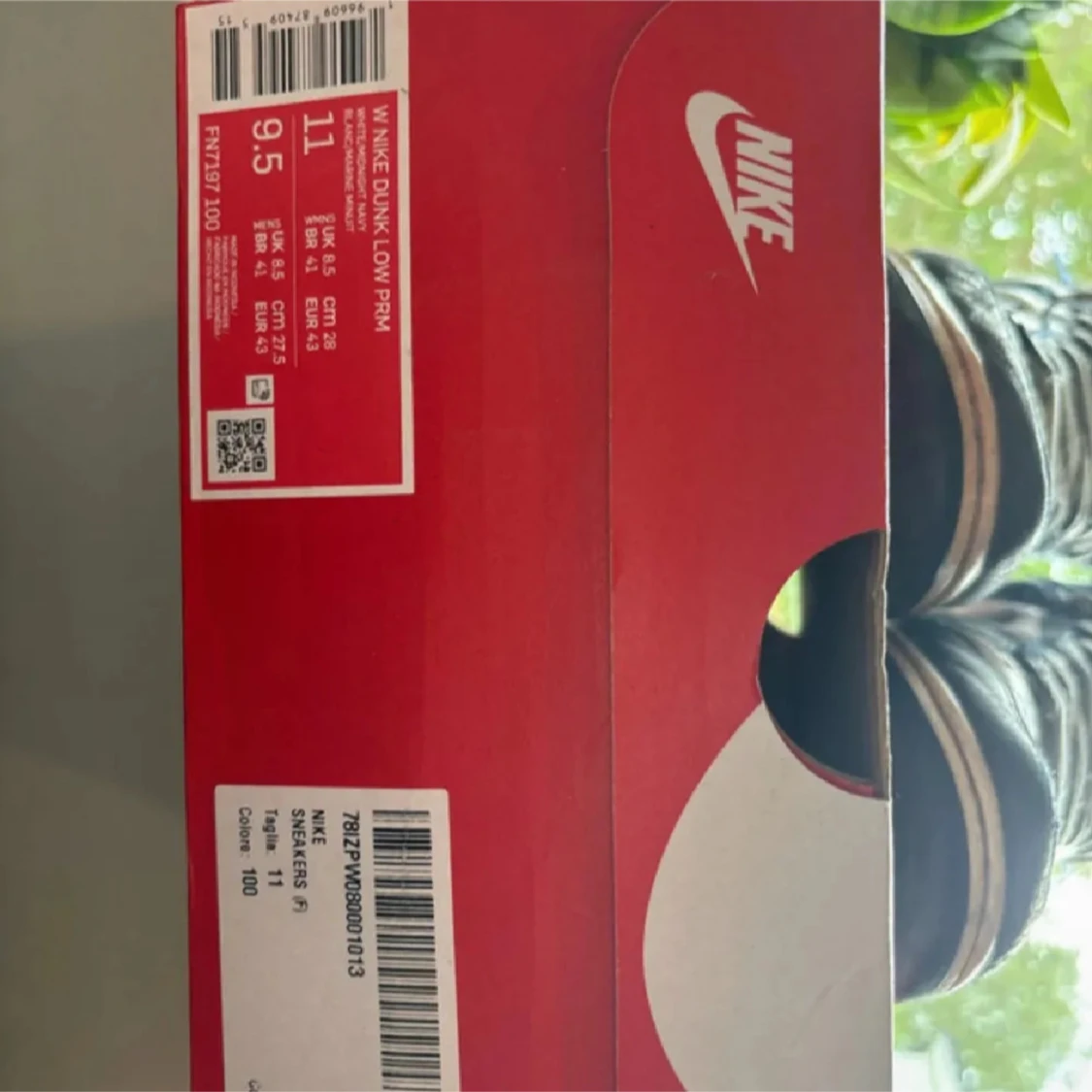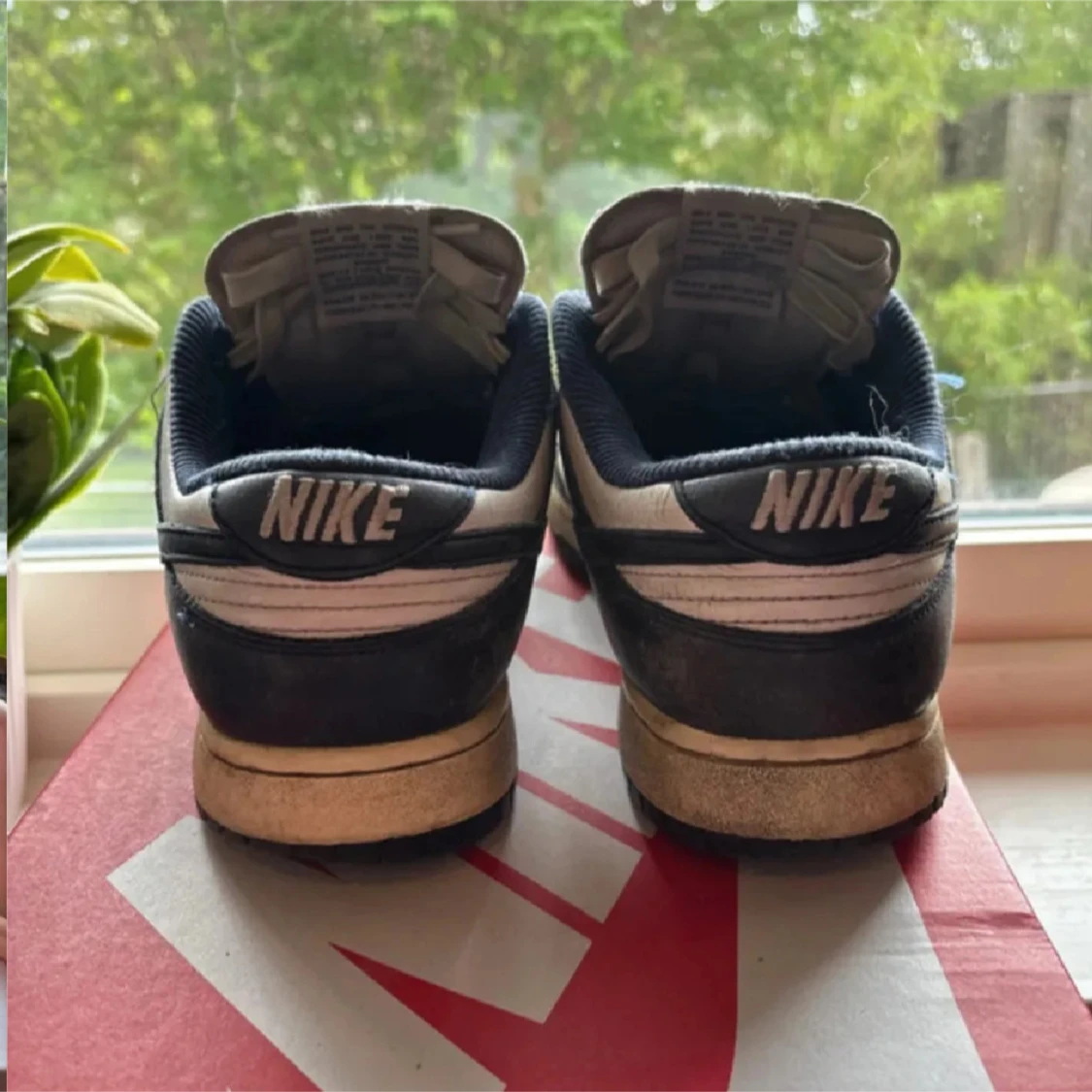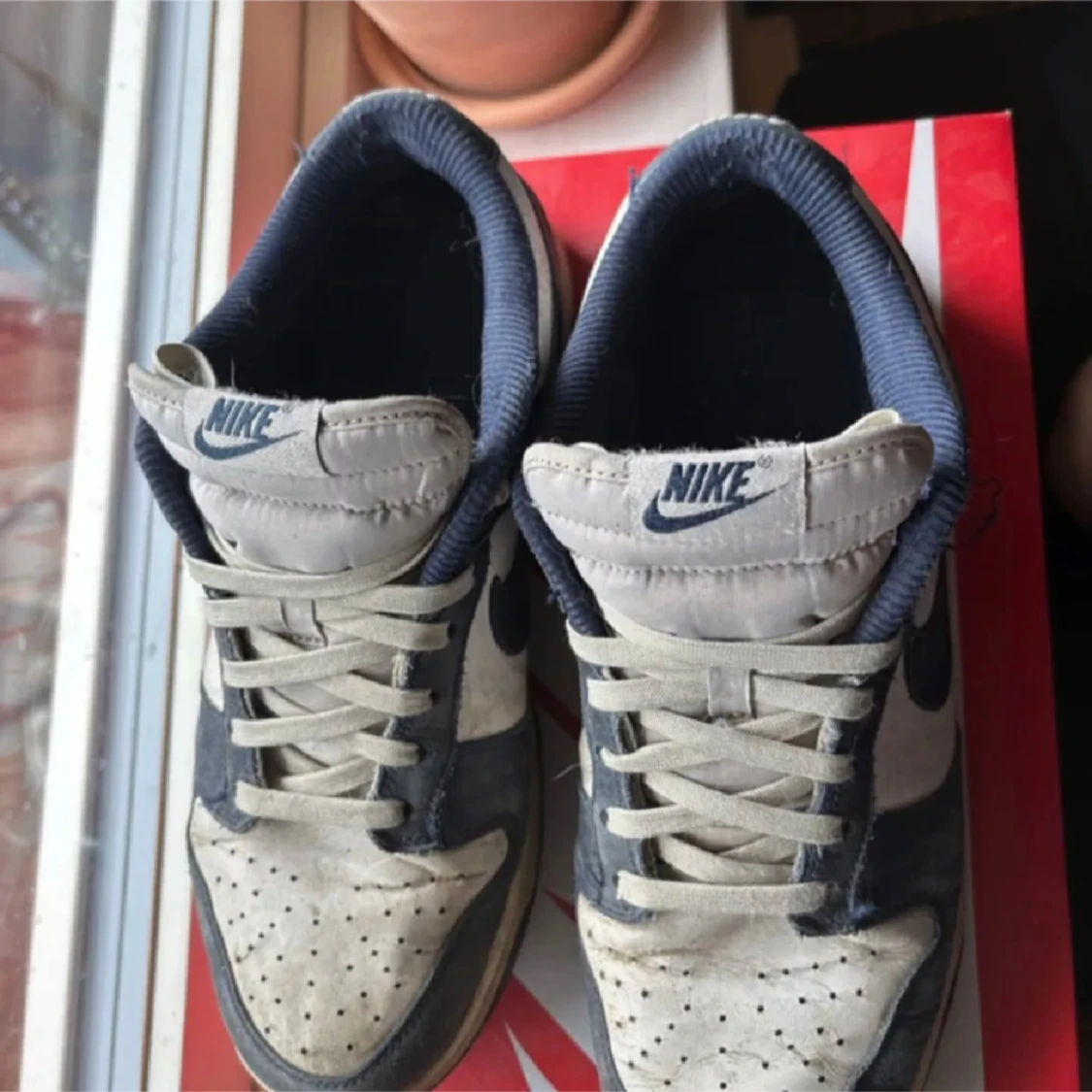 Skorna säljs och skickas med original box. Nike Dunk Low sneakers i marinsblått och vitt med klassisk swoosh på sidorna. Skorna har snörning, perforerad tå och vadderad kant för extra komfort. Ovandelen är i skinn och textil, med en platt sula och rund tå. Perfekt för dig som gillar streetwear och retrostil.