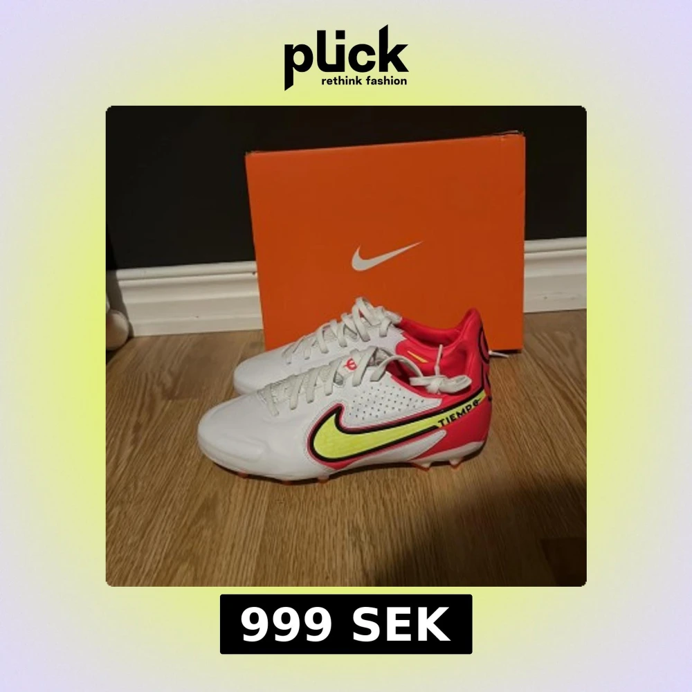 Helt nya Nike Tiempo Legend 9 Pro FG fotbollsskor i vitt med neon-gult Swoosh och detaljer i starkt röd. Skorna har snörning, låg profil och dobbar för fast mark. Ovandelen är i syntetmaterial och designen är riktigt sportig och modern.