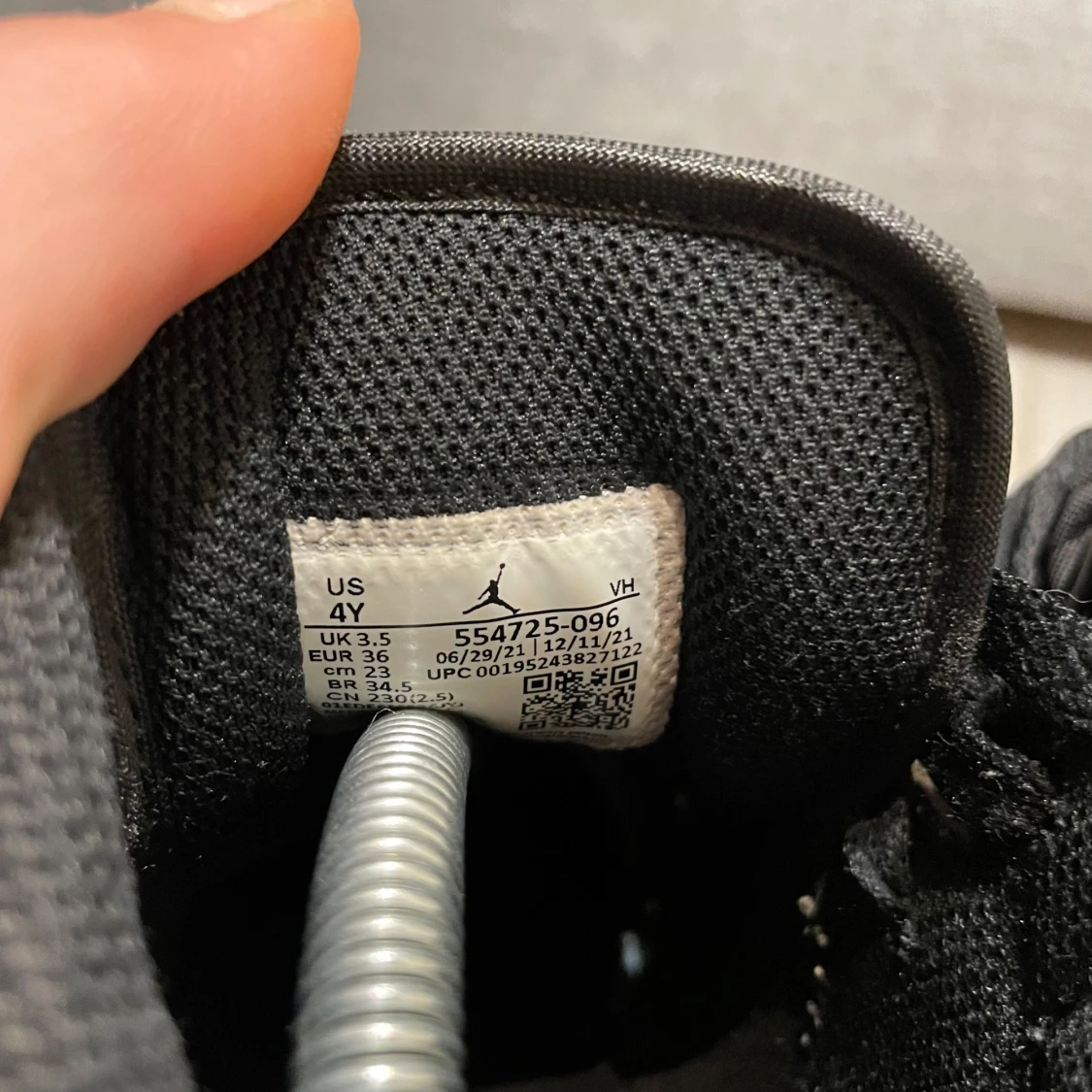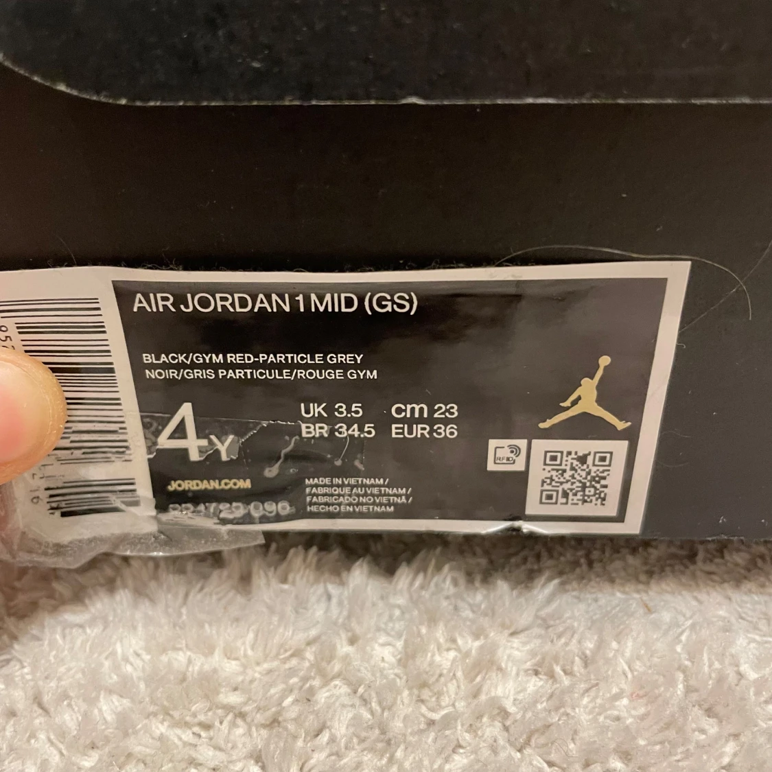 Säljer ett par Nike Air Jordan 1 Mid (GS) i svart och grå med röda detaljer. Skorna har en klassisk design med snörning och en bekväm passform. Perfekta för dig som älskar stilrena sneakers med en touch av färg.