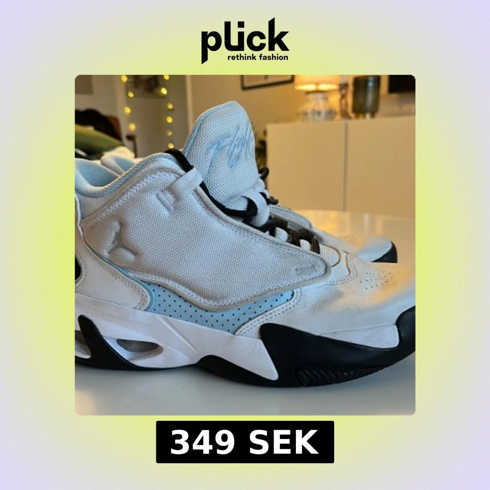 Nike Jordan 1 Flight sneakers i vit och ljusblå färg med svarta detaljer. Skorna har en robust platt sula, snörning och mesh-paneler för extra ventilation. Ikonisk Jumpman-logga på sidan och 'Flight' broderat på plösen. Perfekt för dig som gillar sportig och clean stil.