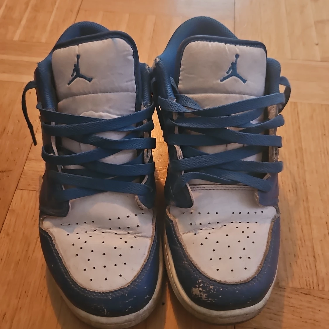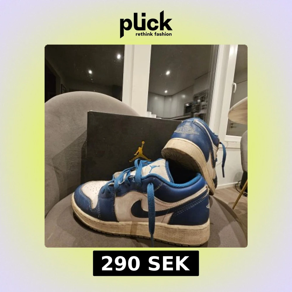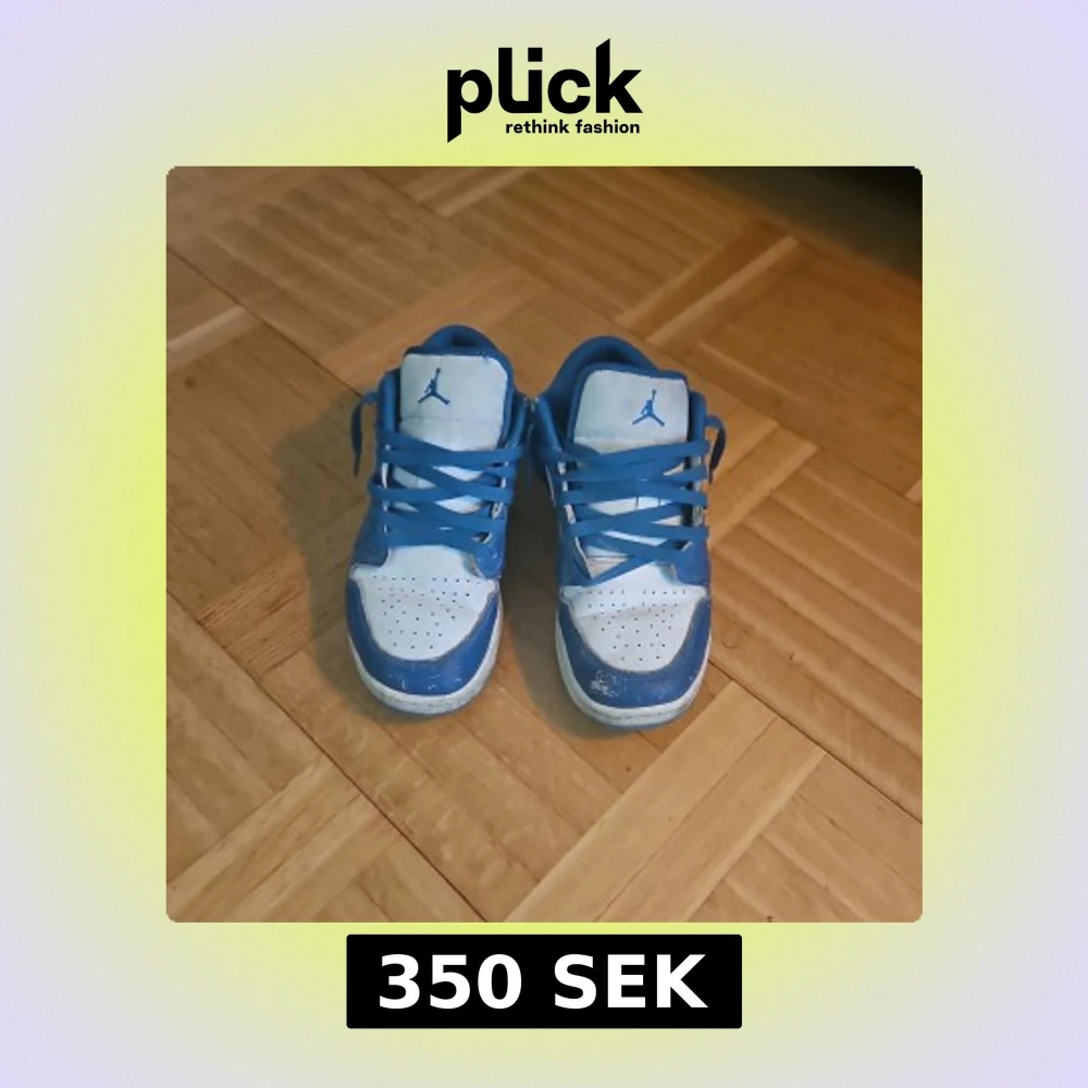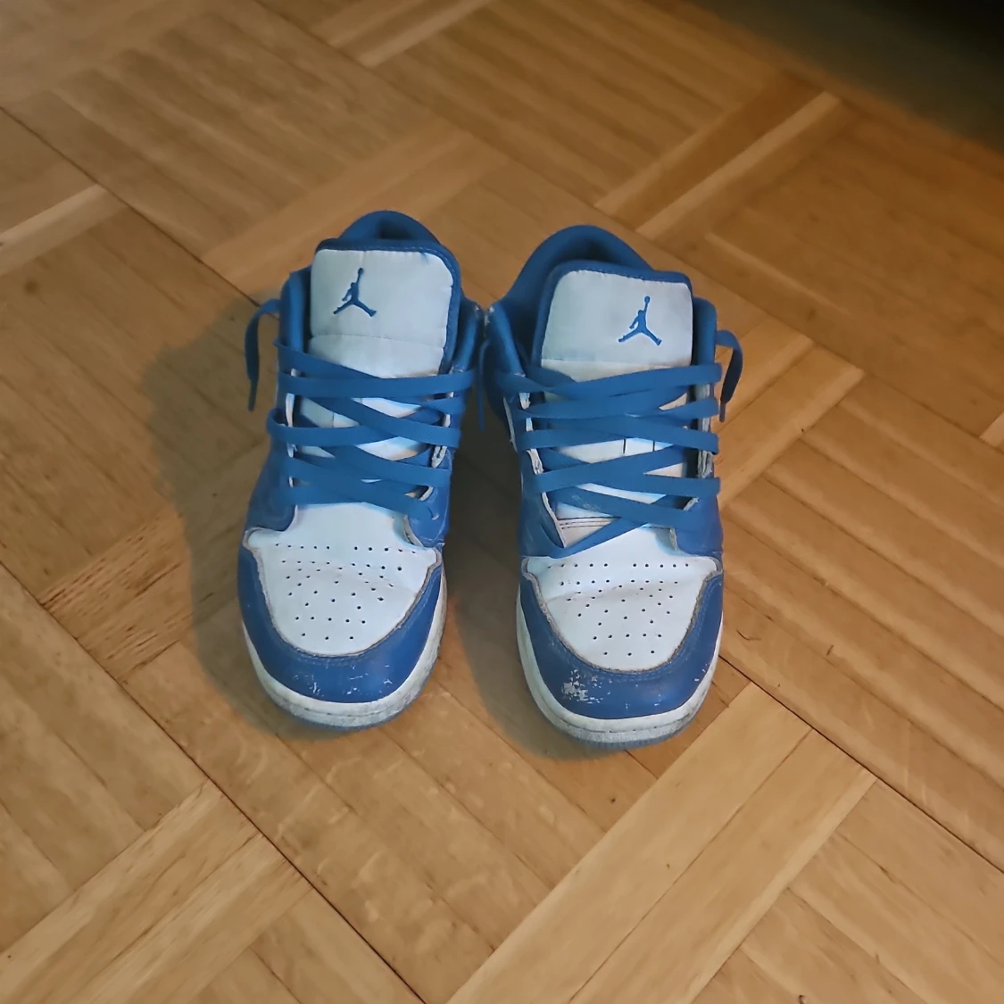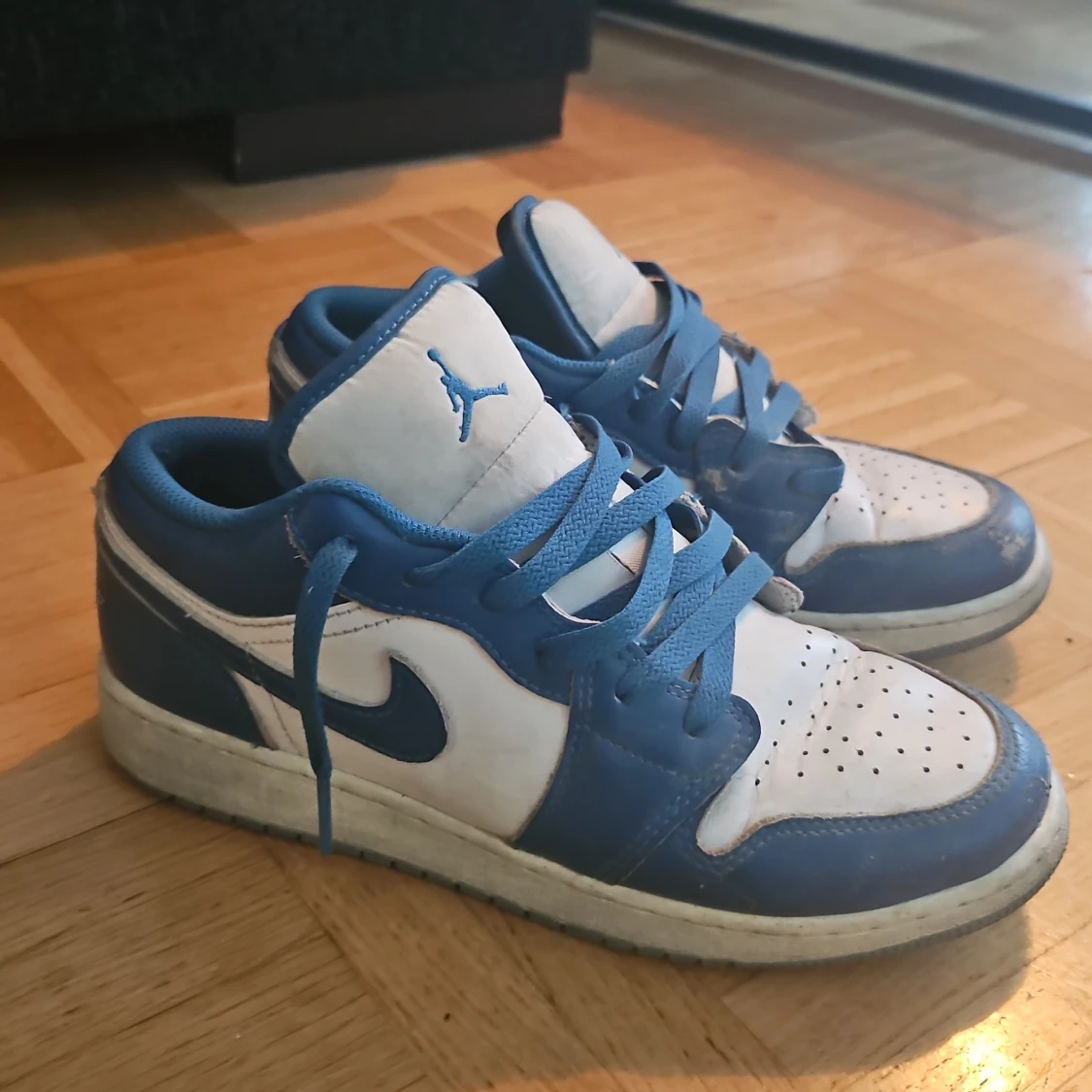 Säljer ett par Nike Air Jordan 1 Low i blått och vitt med klassisk Jumpman-logga på plösen. Skorna har blå snörning, perforerad tåbox och vit sula. Tillverkade i skinn och syntetmaterial, perfekt för dig som gillar streetwear och sneakers med retrovibe.