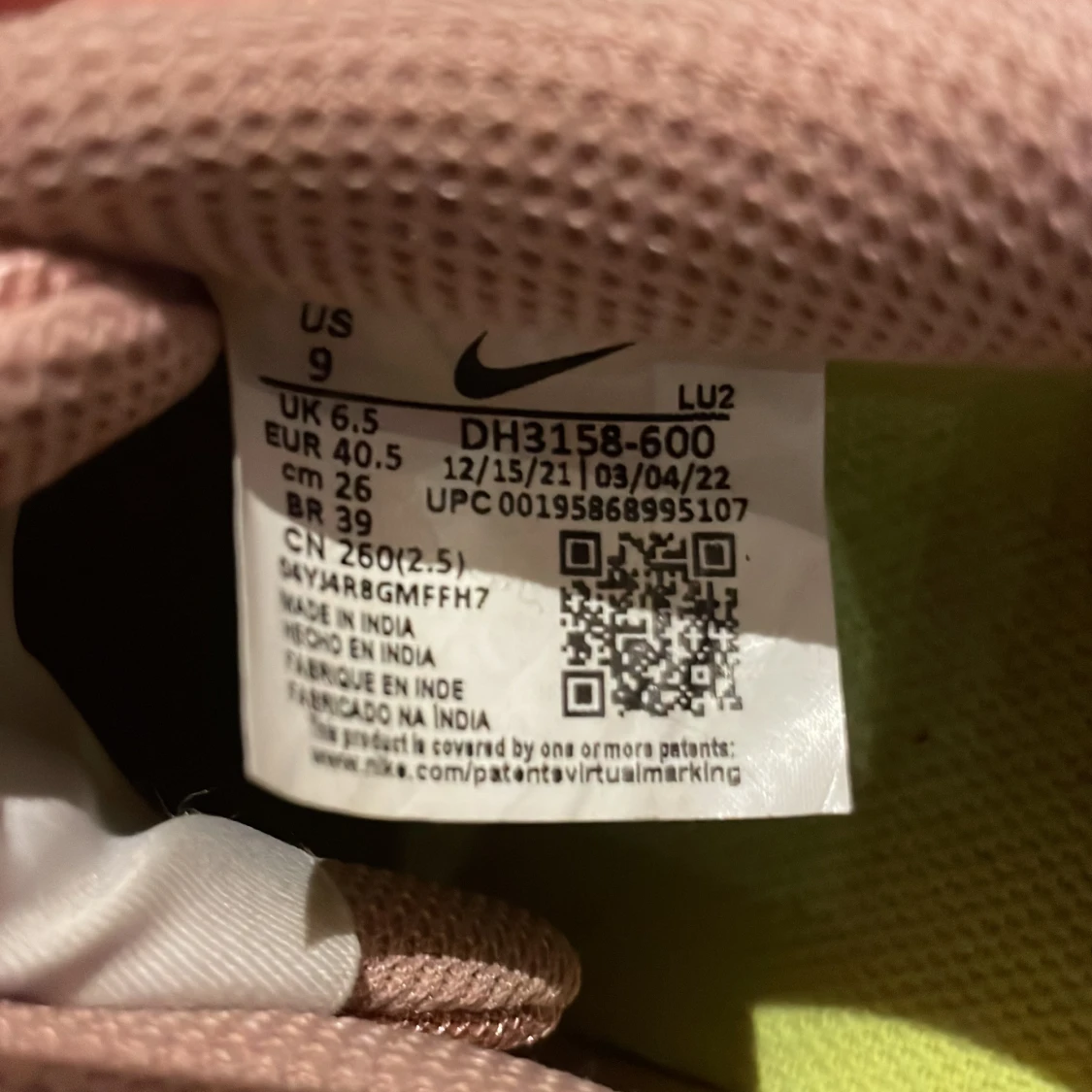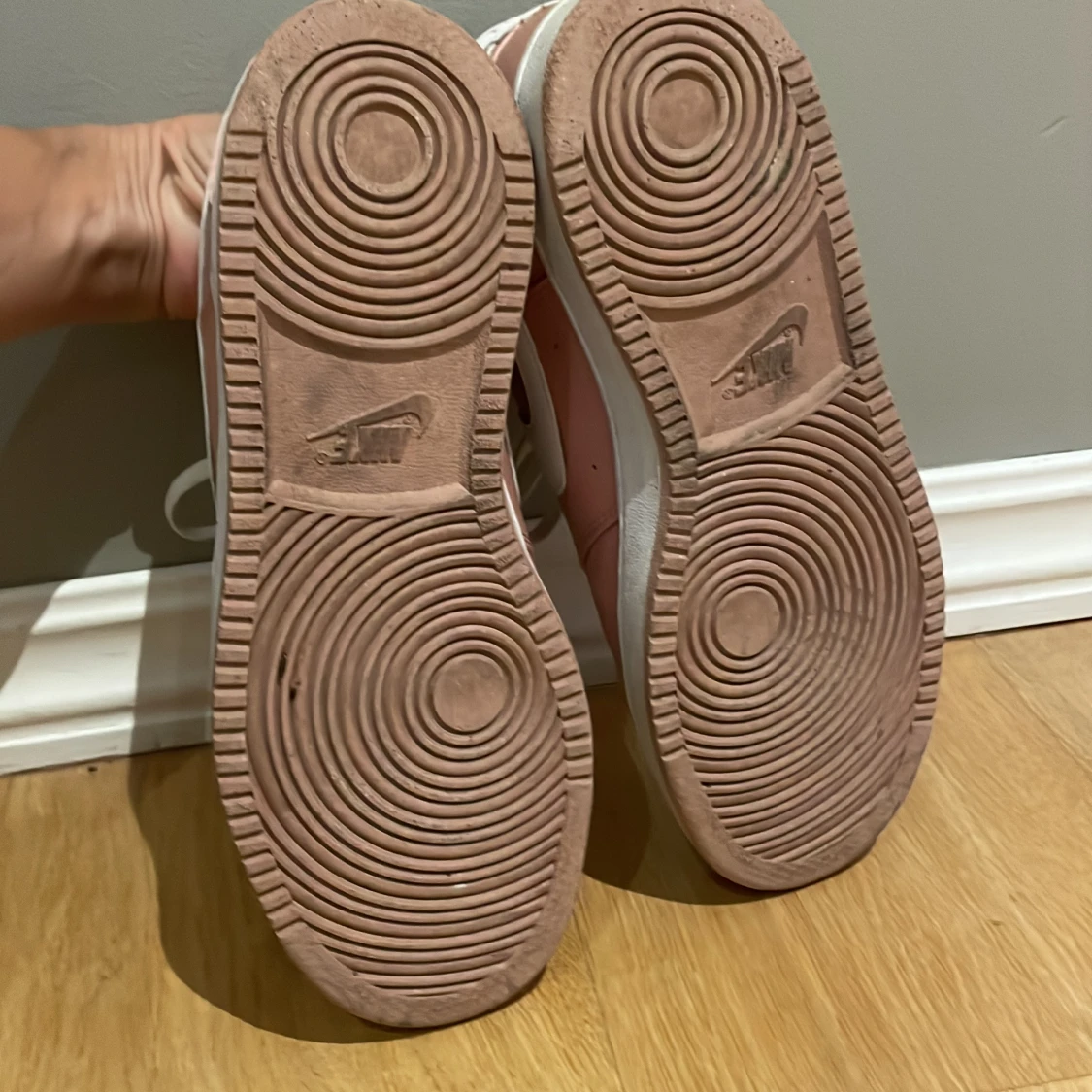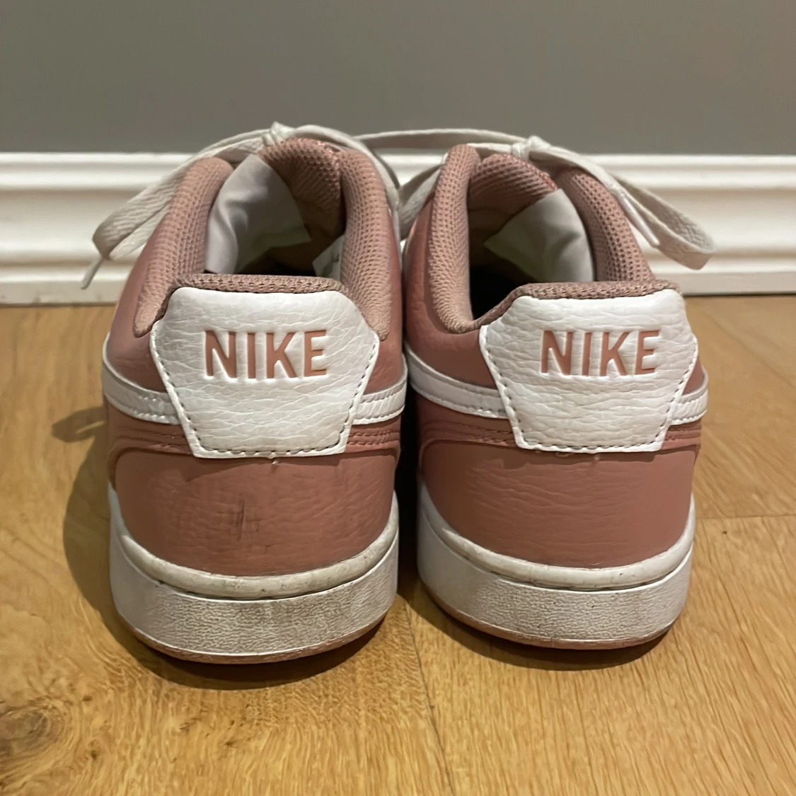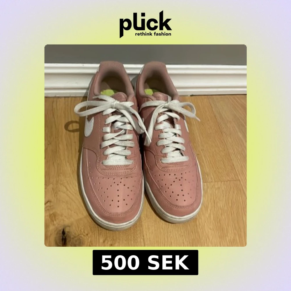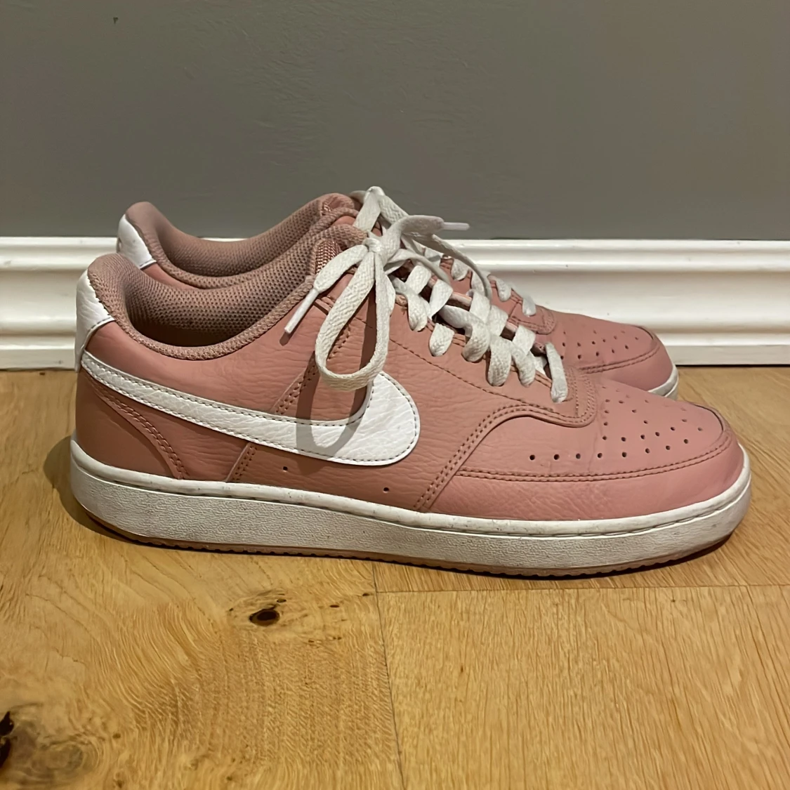 Säljer ett par snygga Nike sneakers i rosa med vita detaljer och vit sula. Skorna har klassisk snörning, rund tå och är tillverkade i syntetmaterial med skinnkänsla. Använda ett fåtal gånger.