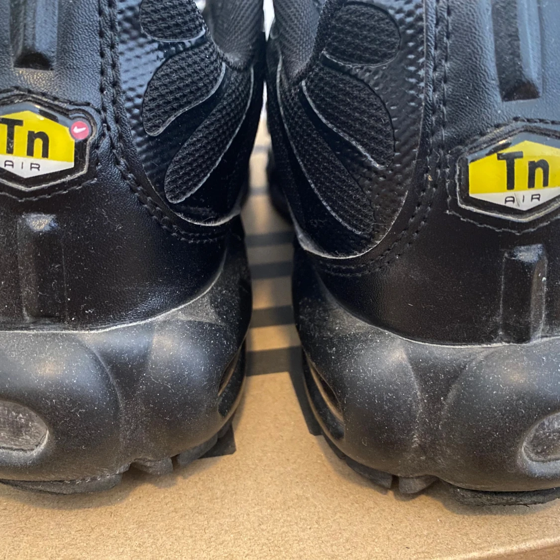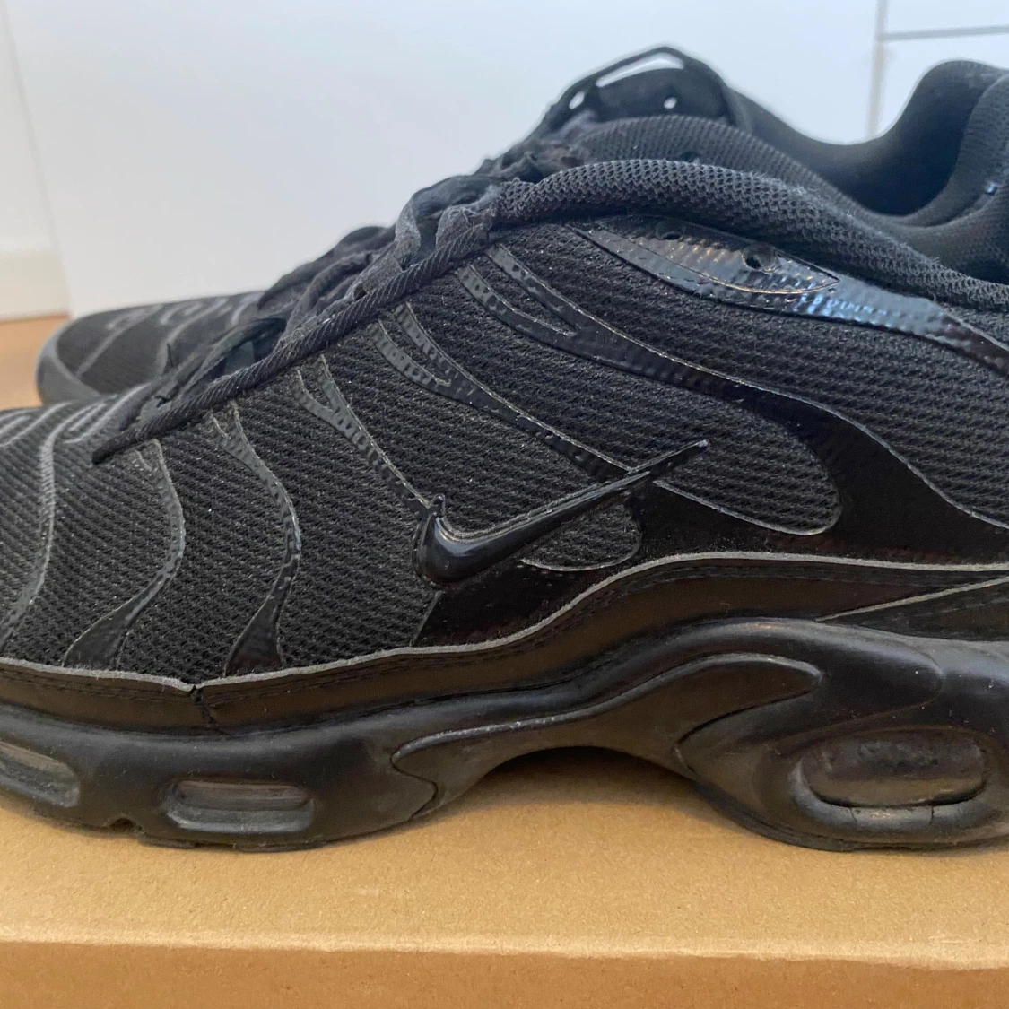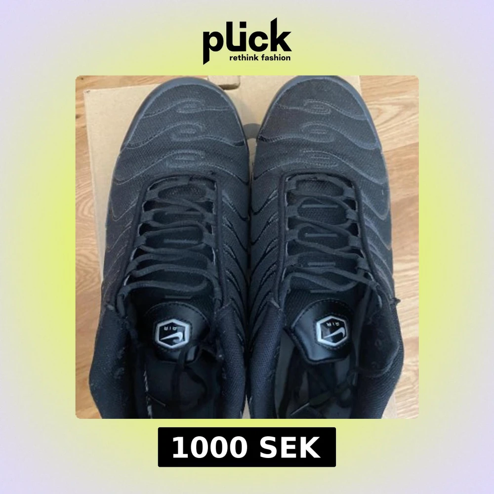 Nike Air Max Plus Tn i helsvart med mesh och syntetpaneler, ikoniska vågformade detaljer och Tn Air-logga bak. Skorna har snörning, platt sula och synliga Air Max-enheter i sulan för extra komfort. Perfekt för dig som gillar streetwear och sportig stil. Kontakta mig vid behov av fler bilder!