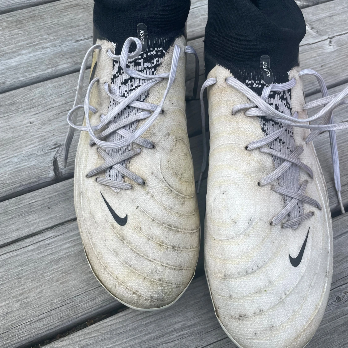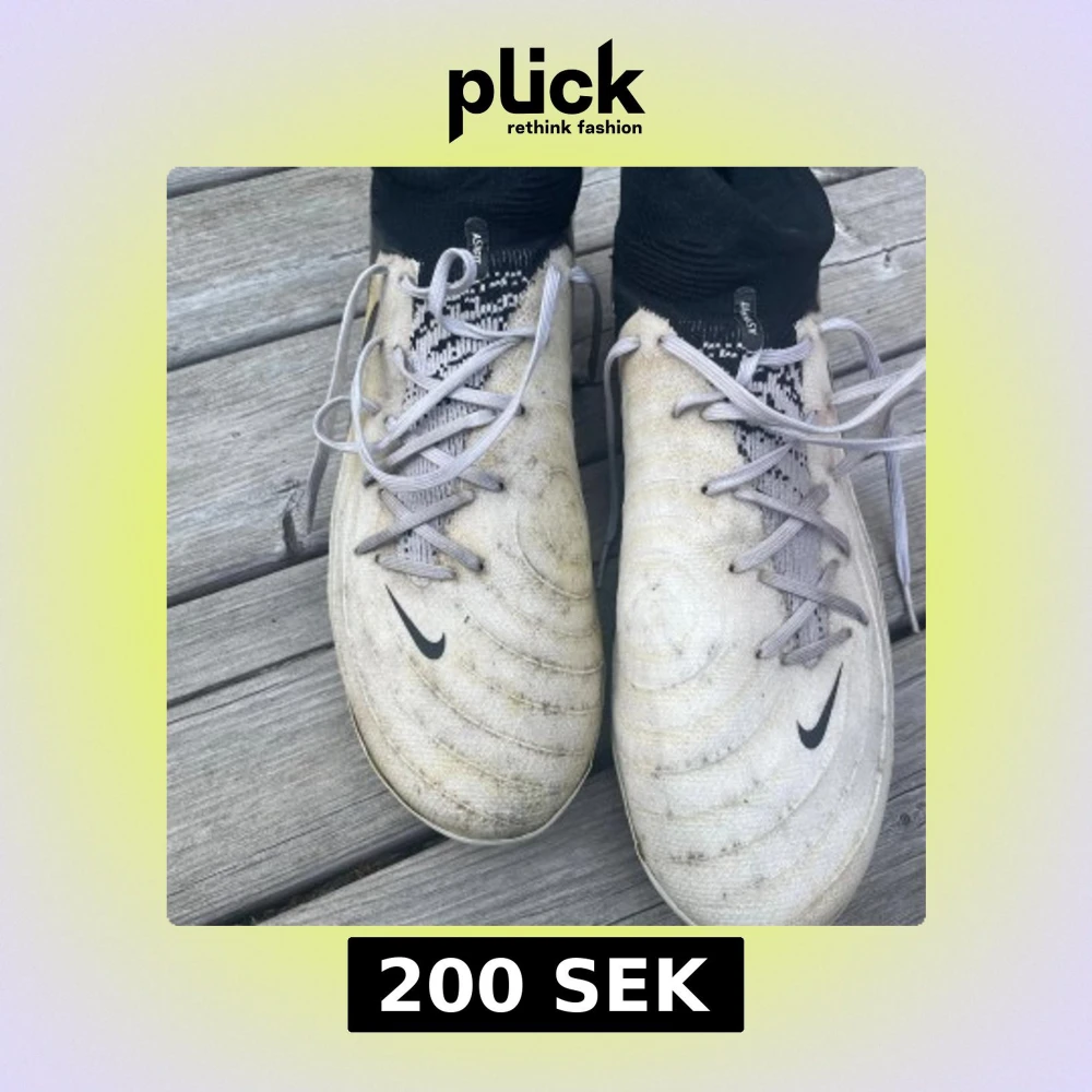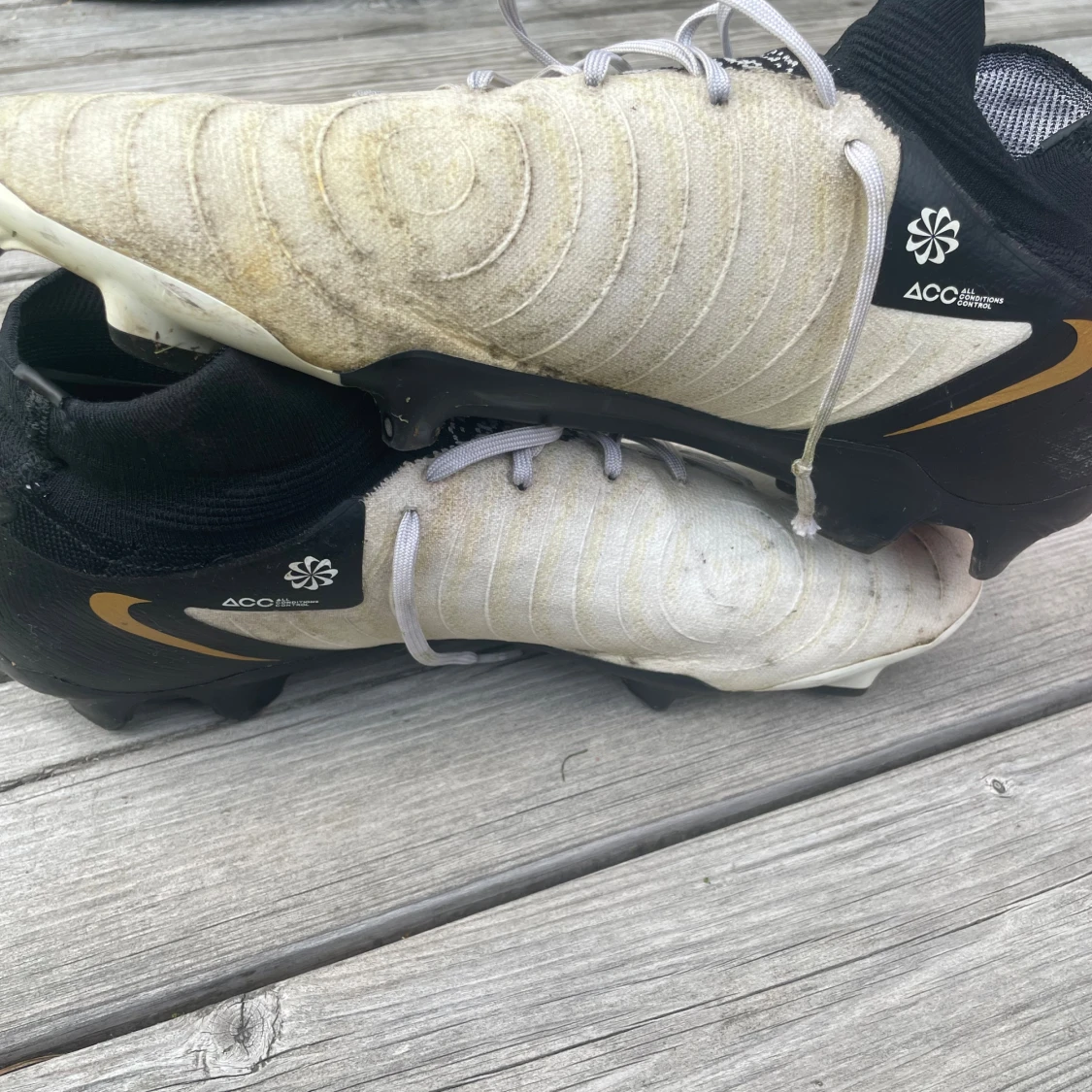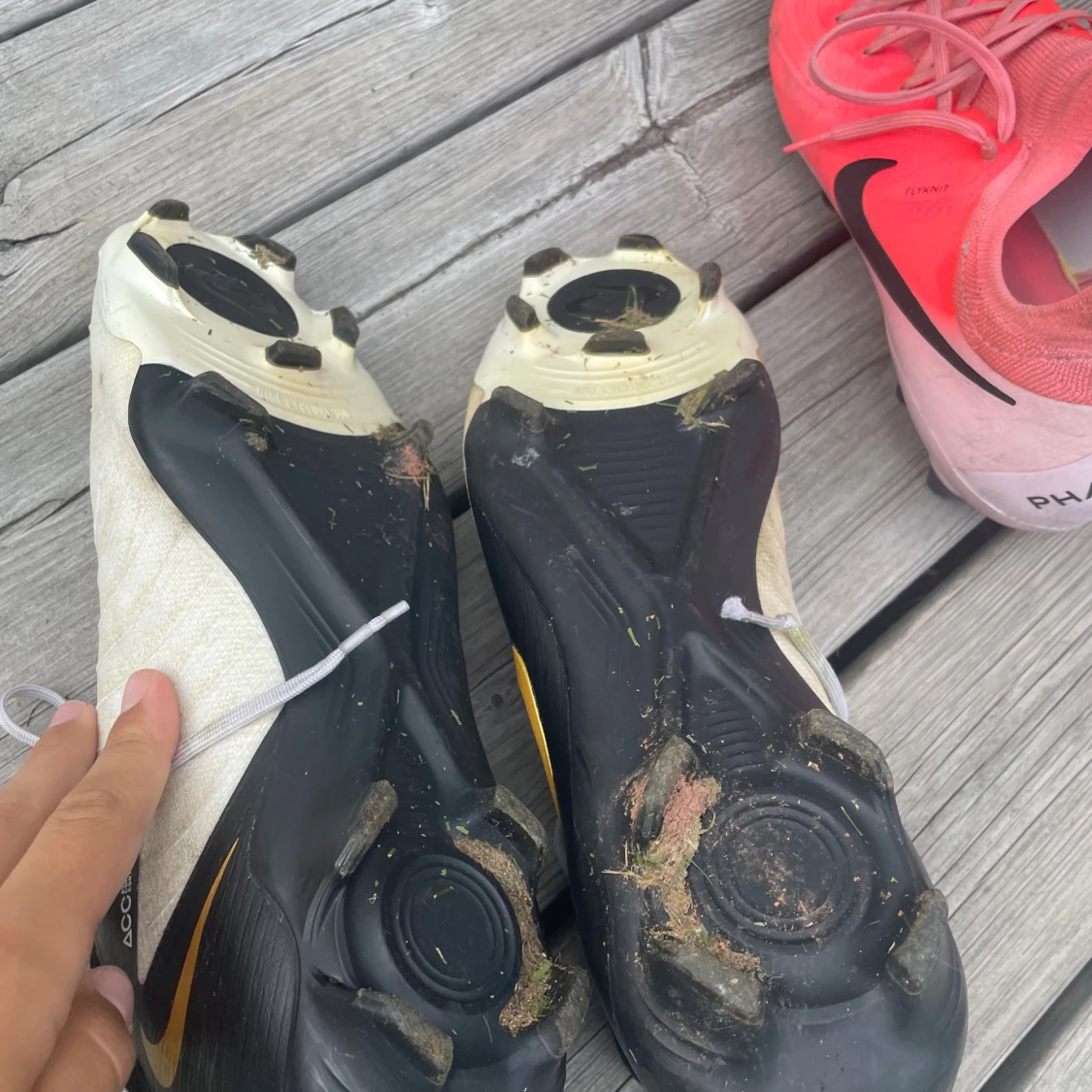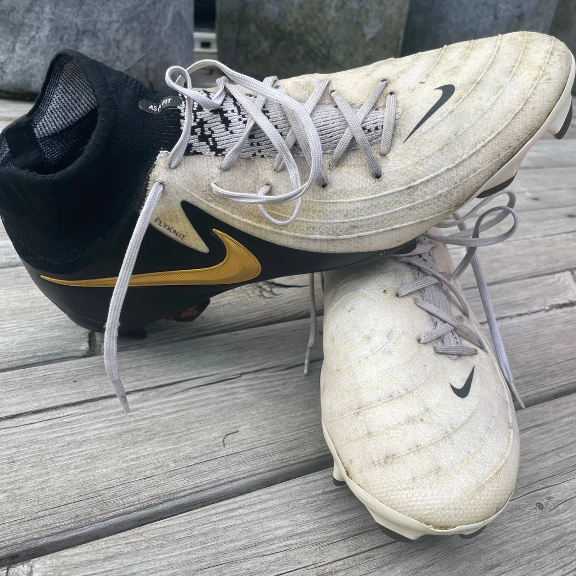 Säljer ett par Nike Flyknit fotbollsskor i vitt, svart och guld. Skorna har högt skaft, snörning och svart Nike-logga framtill samt guldlogga på sidan. Ovandelen är i syntetmaterial med stickade detaljer och mönstrad plös. Perfekta för dig som vill sticka ut på planen.