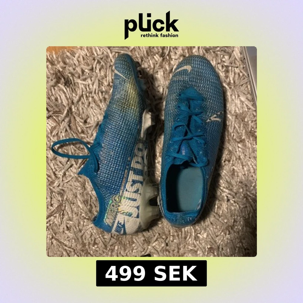 Snygga blå Nike fotbollsskor med vit text och snörning. Perfekta för fotbollsplanen med en stilren design och bra grepp.