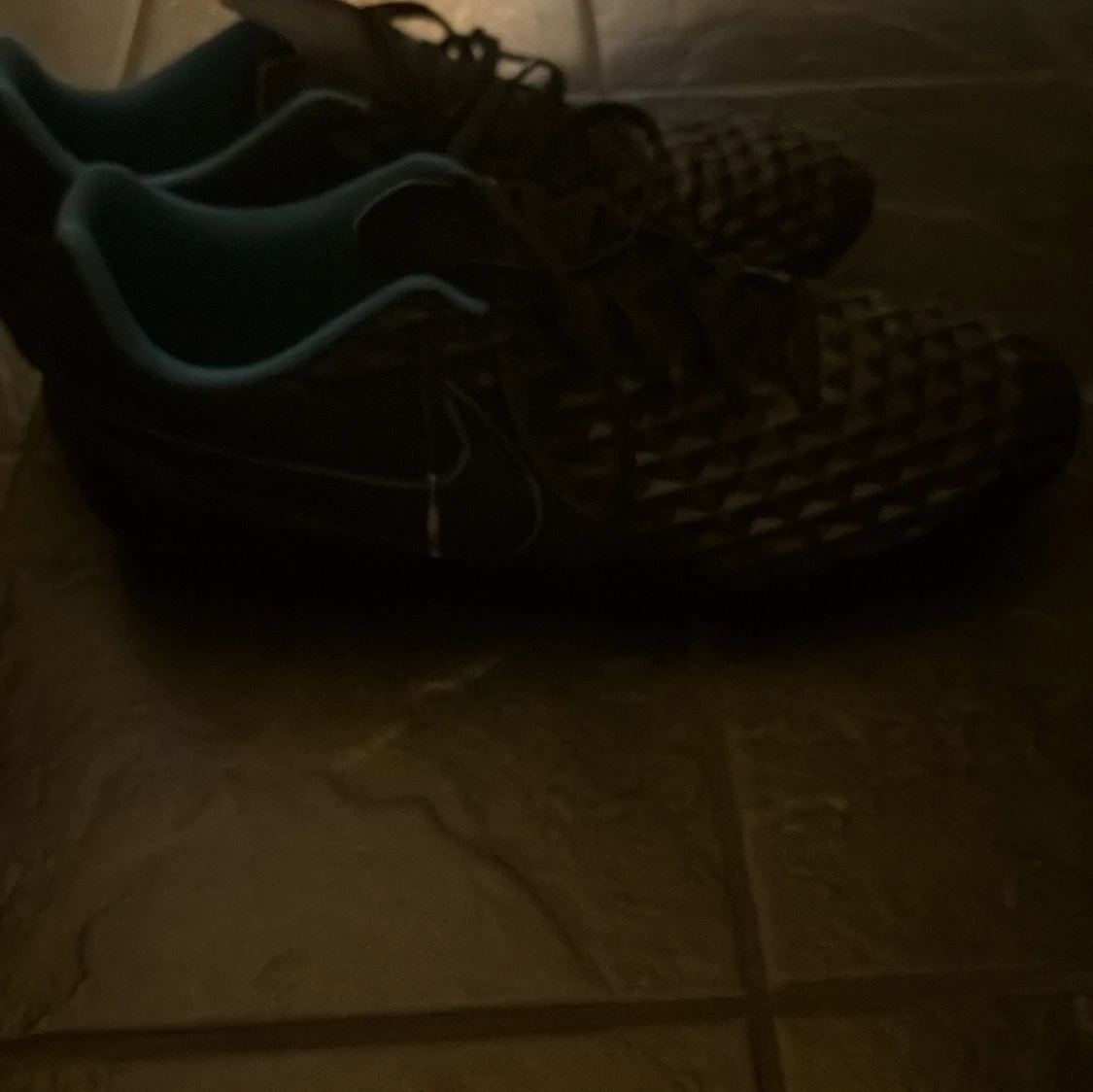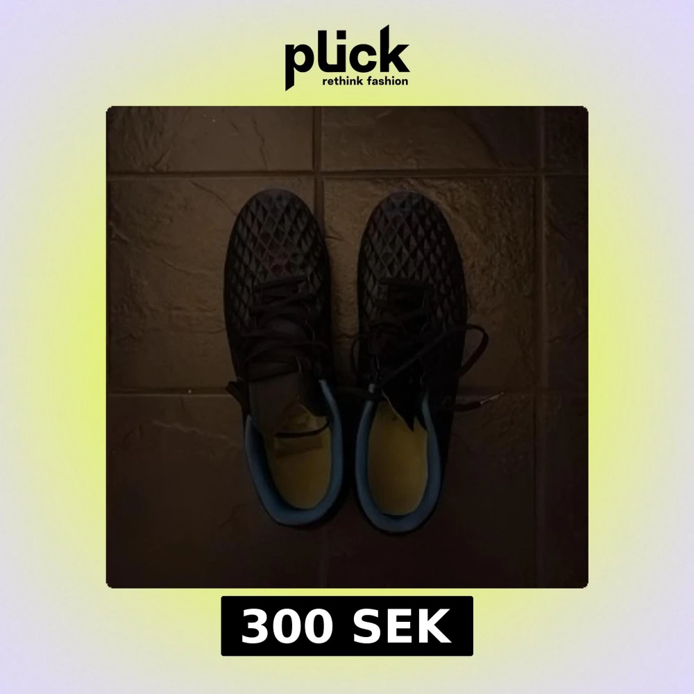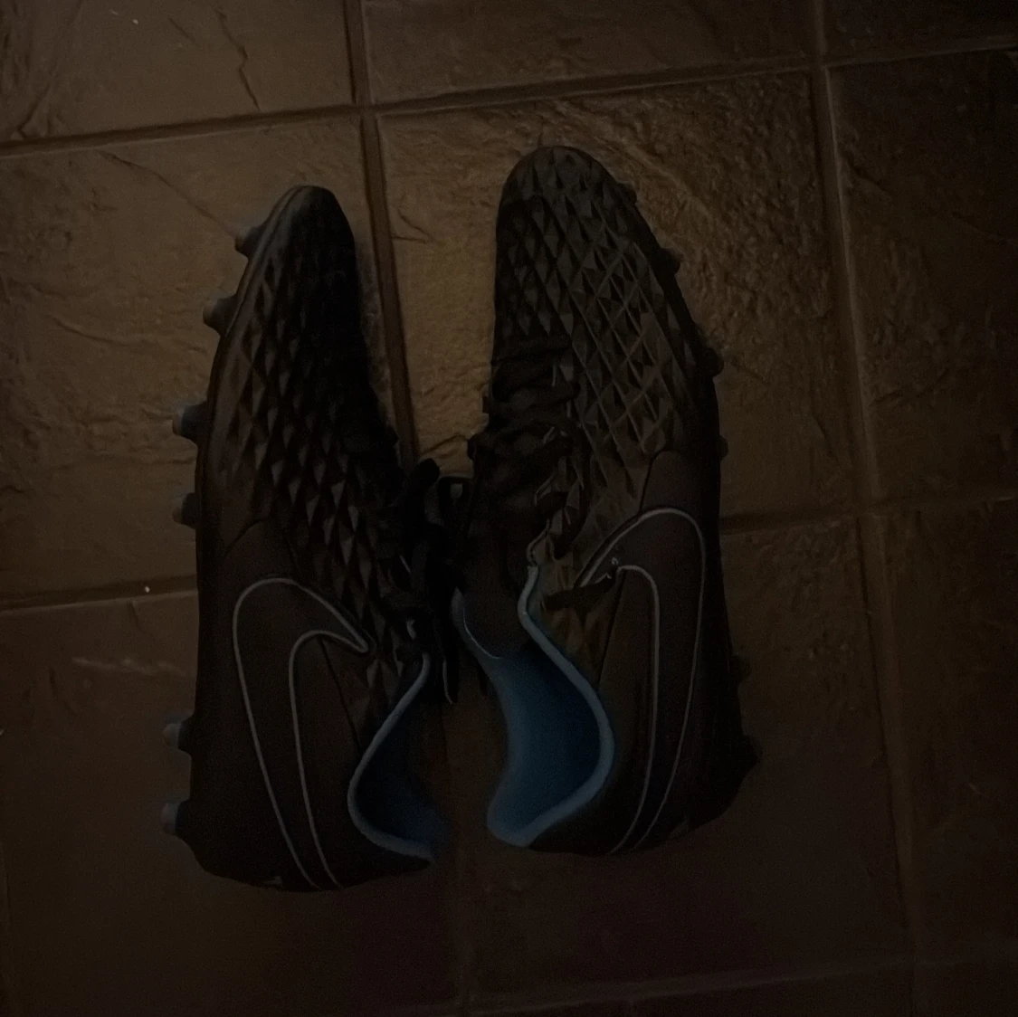 Säljer ett par svarta Nike Tiempo fotbollsskor med coolt diamantmönster på ovandelen och blå insida. Skorna har snörning och dobbar för gräsplan. Perfekta för dig som vill ha stilrena och funktionella skor på planen. Skorna är oanvända