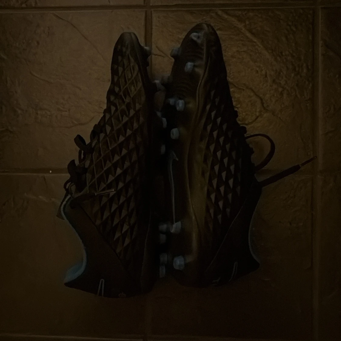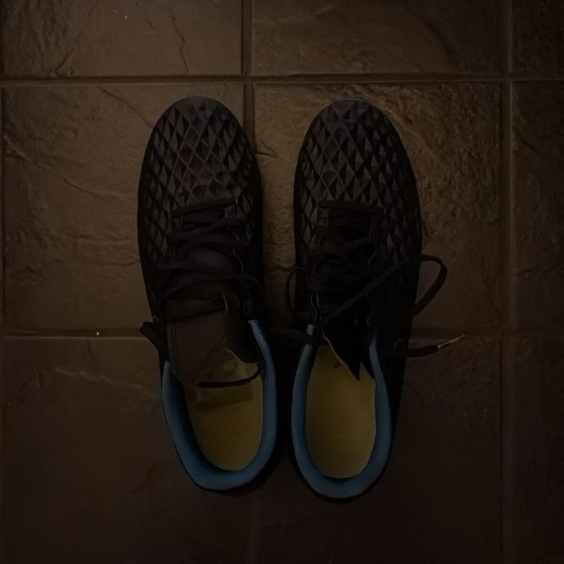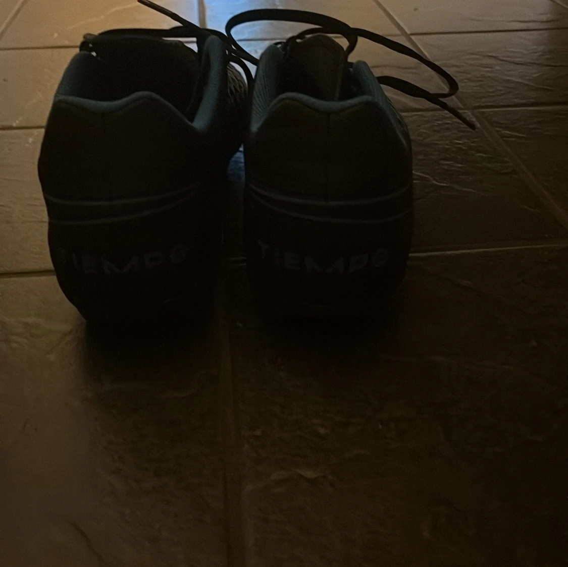 Säljer ett par svarta Nike Tiempo fotbollsskor med coolt diamantmönster på ovandelen och blå insida. Skorna har snörning och dobbar för gräsplan. Perfekta för dig som vill ha stilrena och funktionella skor på planen. Skorna är oanvända