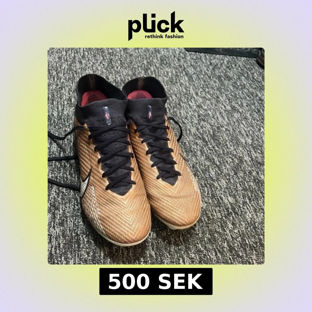 Snygga Nike fotbollsskor i guld med svarta detaljer och snörning. Skorna har en modern design med en slitstark sula och är perfekta för fotbollsplanen.