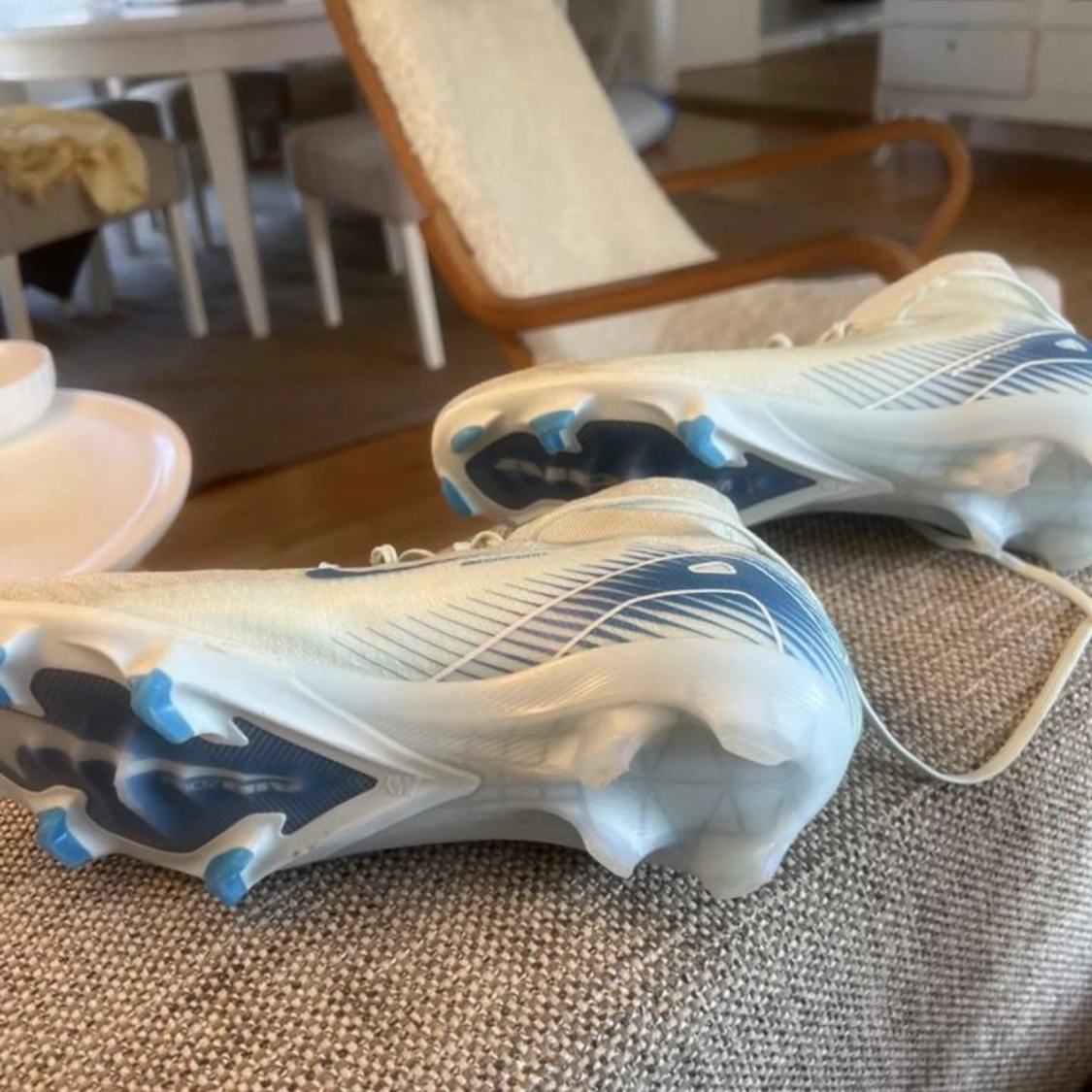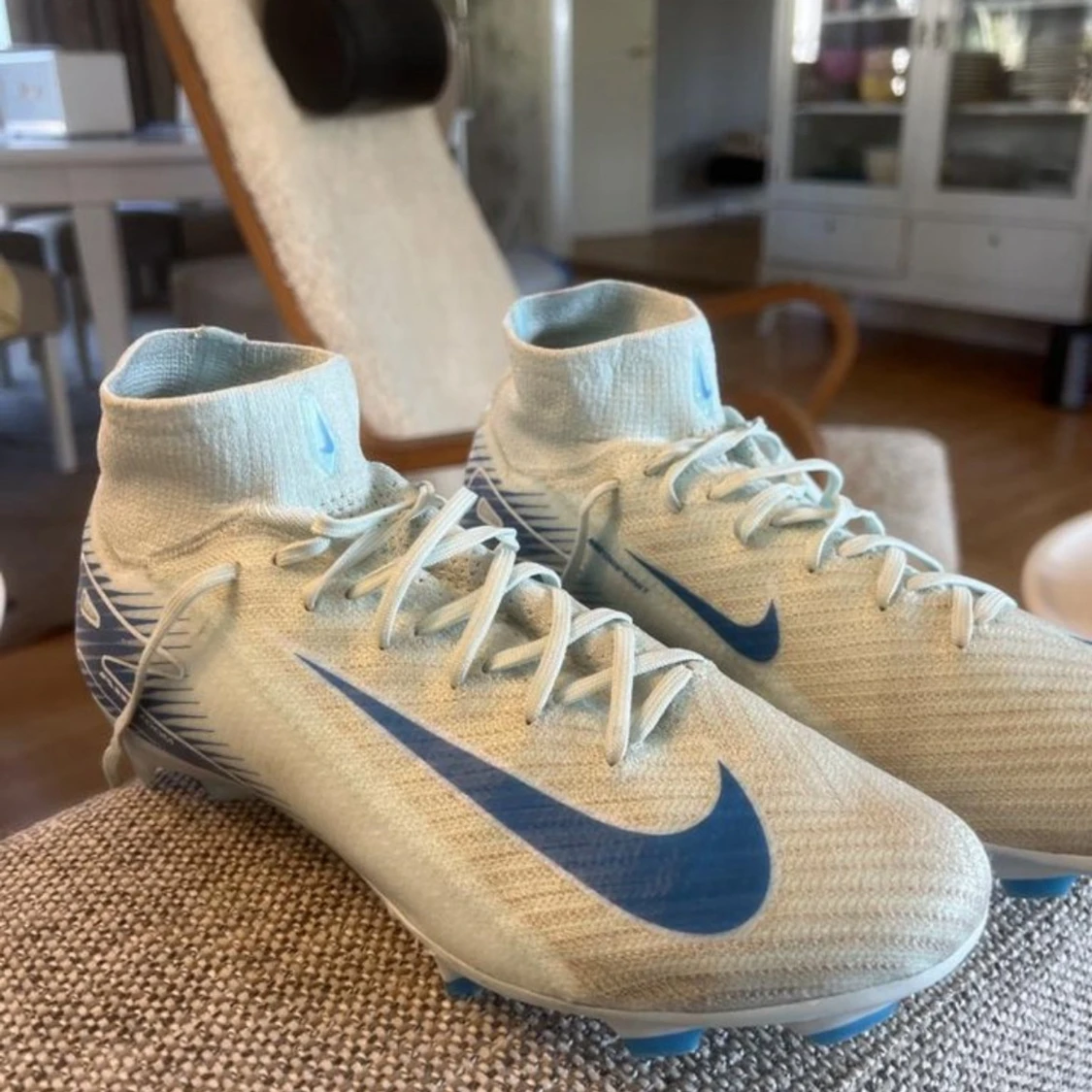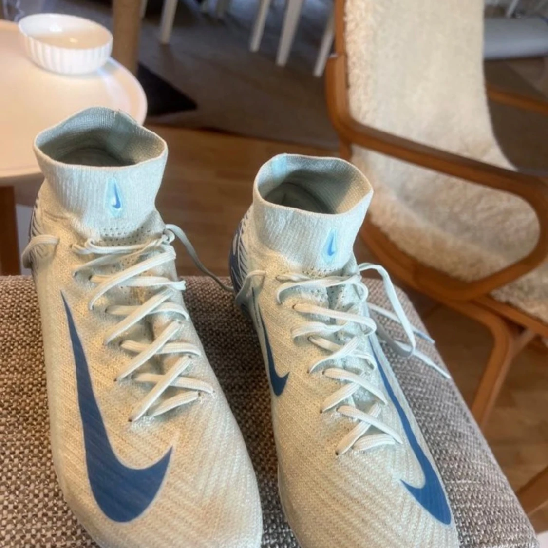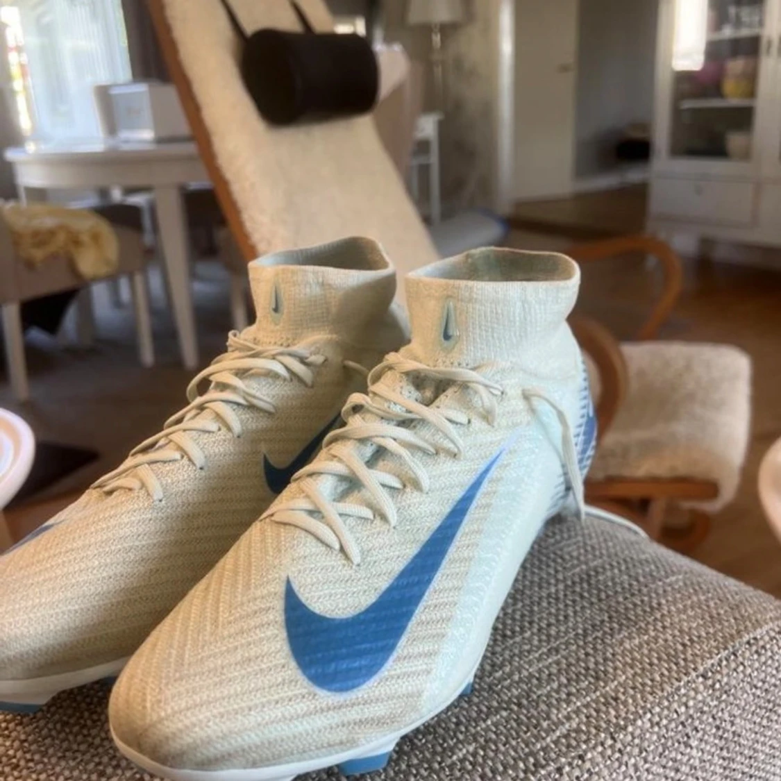 Snygga fotbollsskor från Nike i ljusblått med högt skaft och stora blå swoosh-loggor på sidorna. Skorna har snörning, mönstrad ovandel i syntetmaterial och dobbar i blått och vitt för bästa grepp på planen. Perfekta för dig som vill sticka ut på matchen.