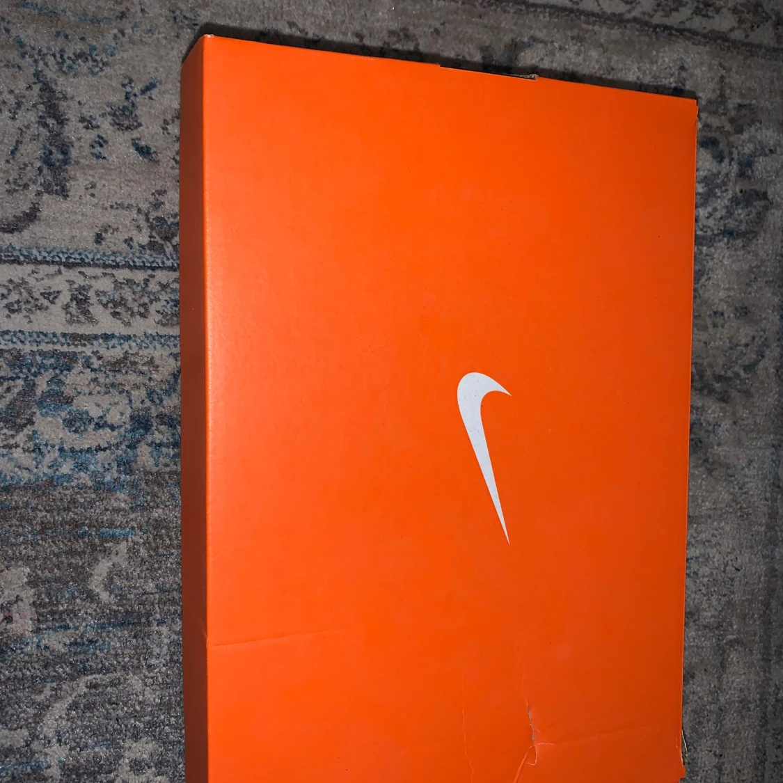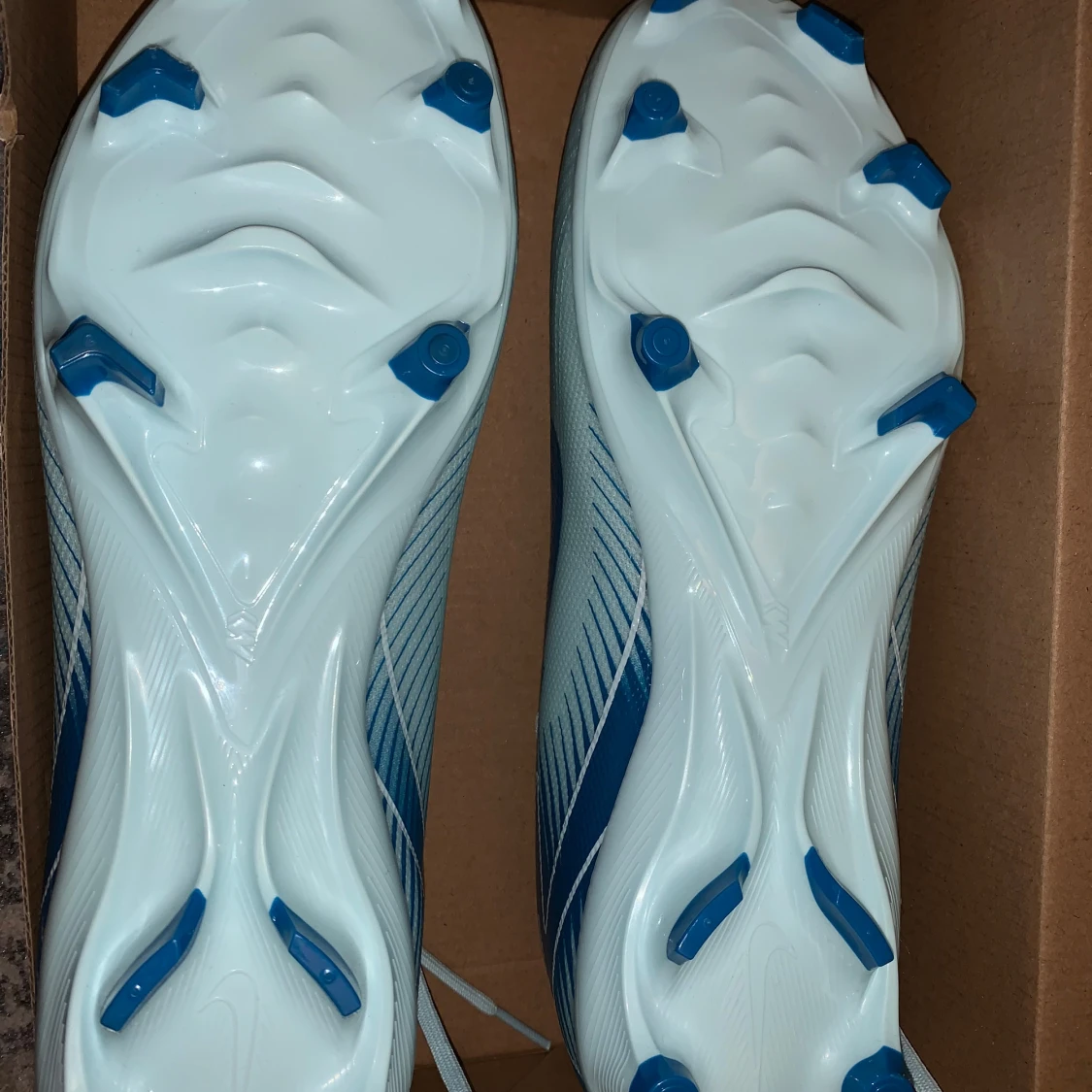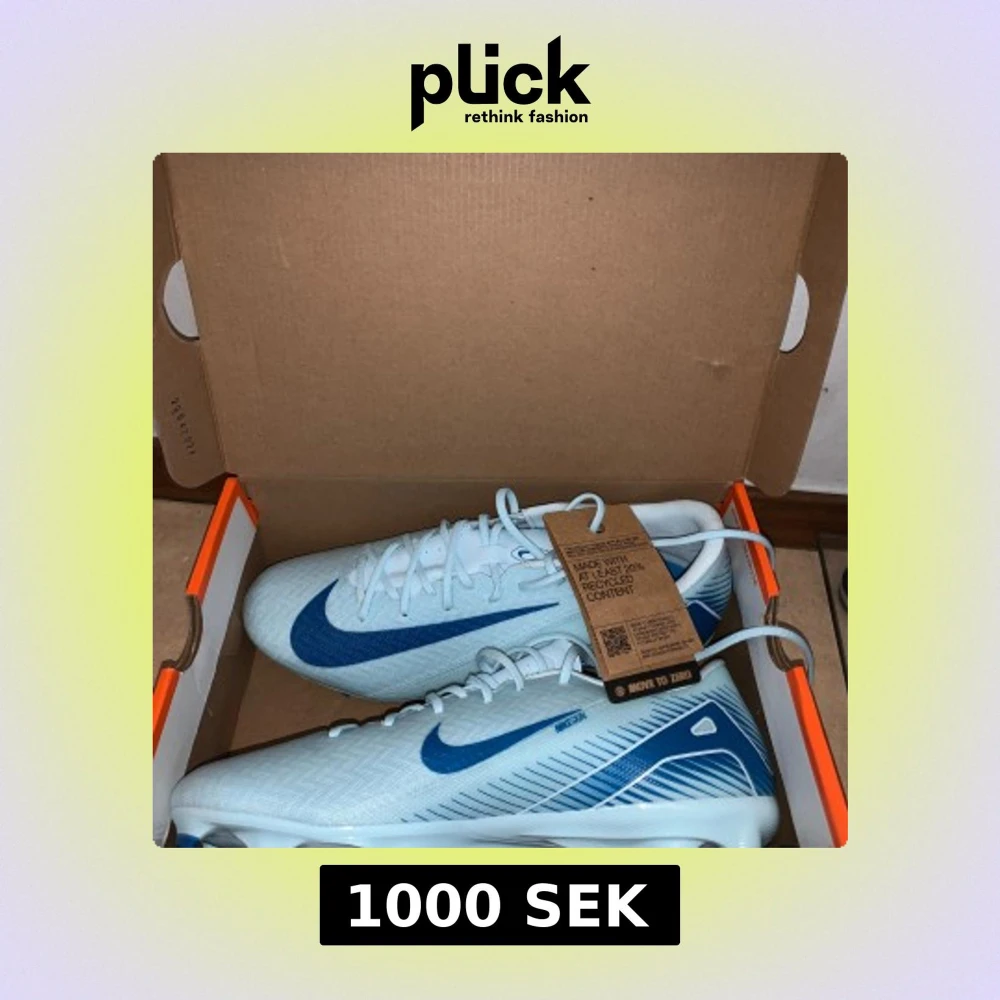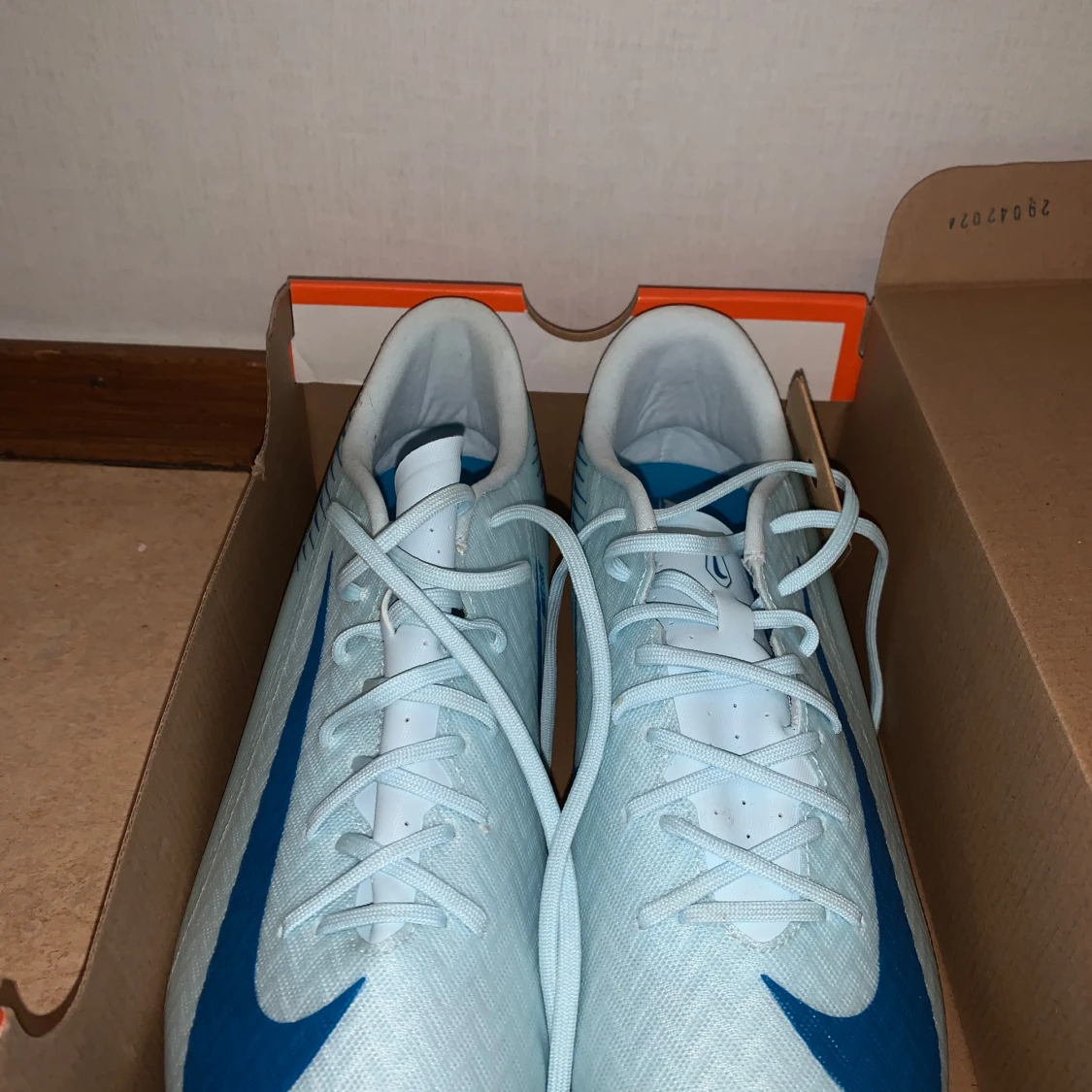 Säljer ett par fräscha Nike fotbollsskor i vitt med blå detaljer och snörning. Skorna har en sportig design med rund tå och platt sula med fasta dobbar, perfekta för spel på gräs. Kommer i originalkartong.