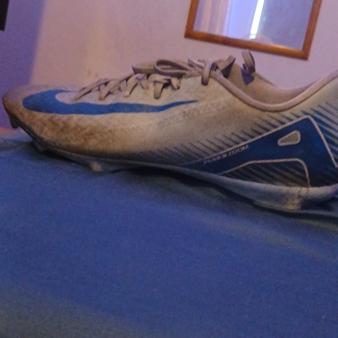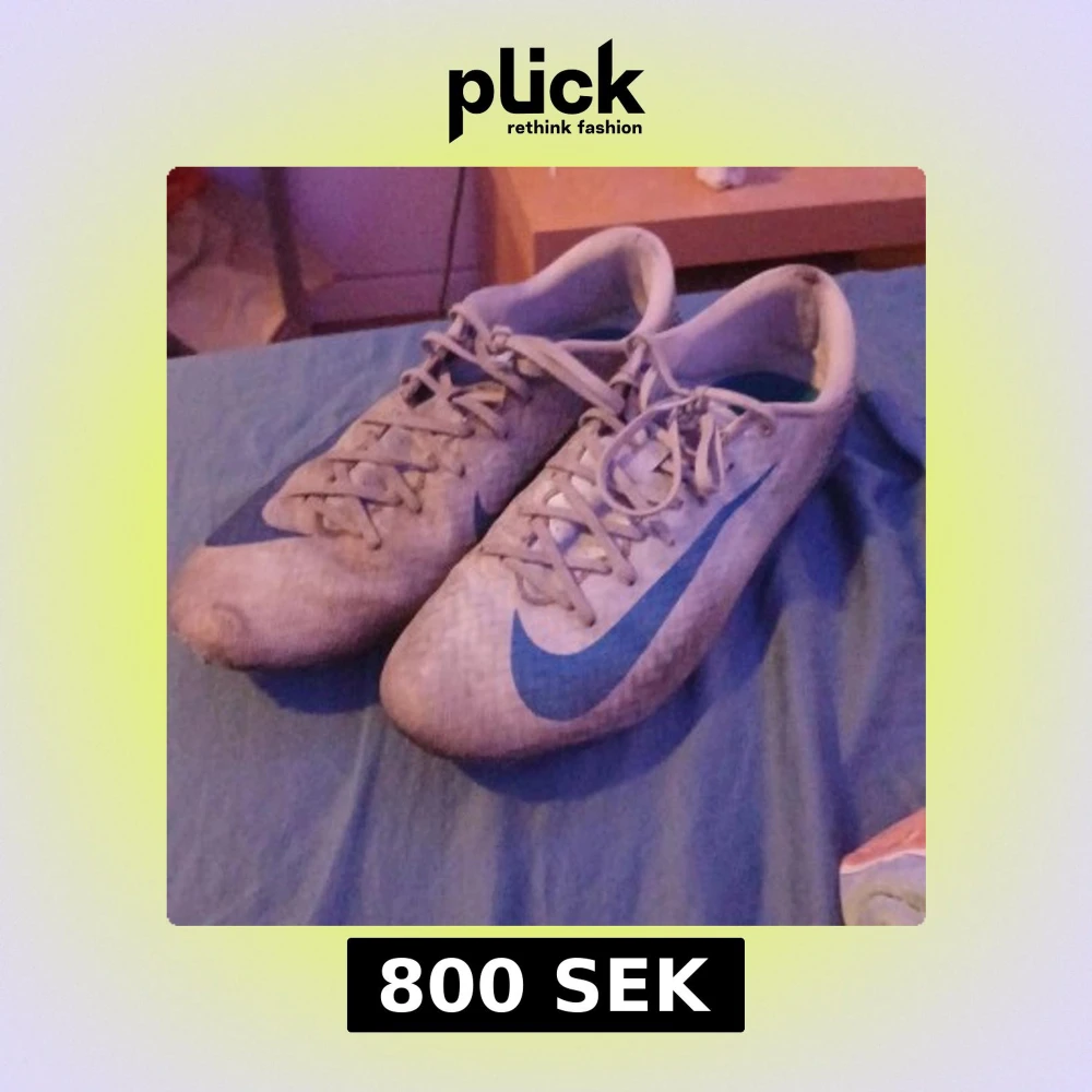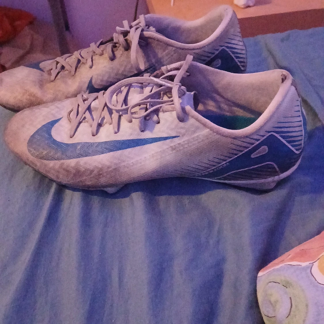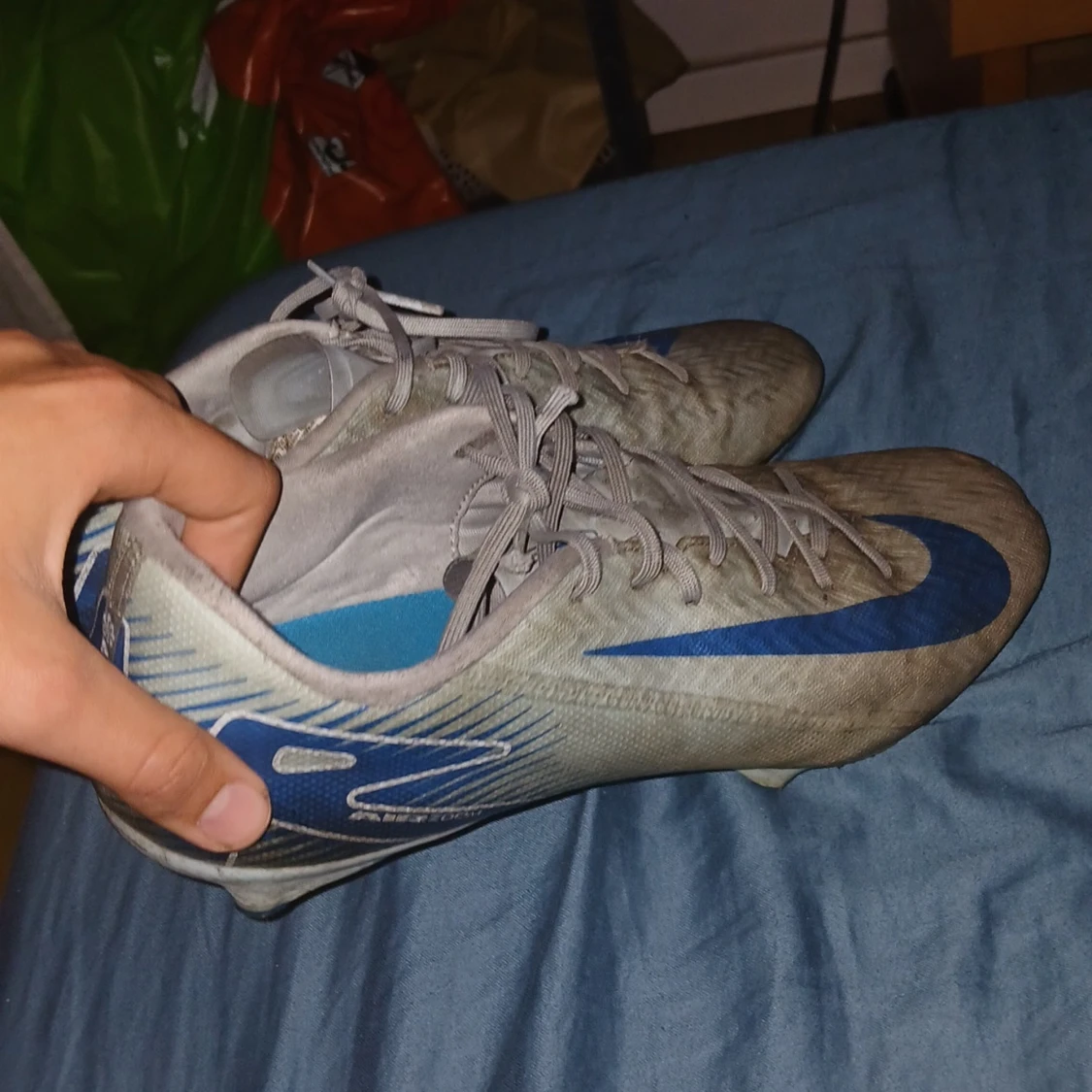 Säljer ett par Nike fotbollsskor i vitt med blå detaljer och snörning. Skorna har en låg profil och är tillverkade i syntetmaterial med klassisk Nike swoosh på sidan. Perfekta för dig som vill ha stilrena och lätta skor på planen.