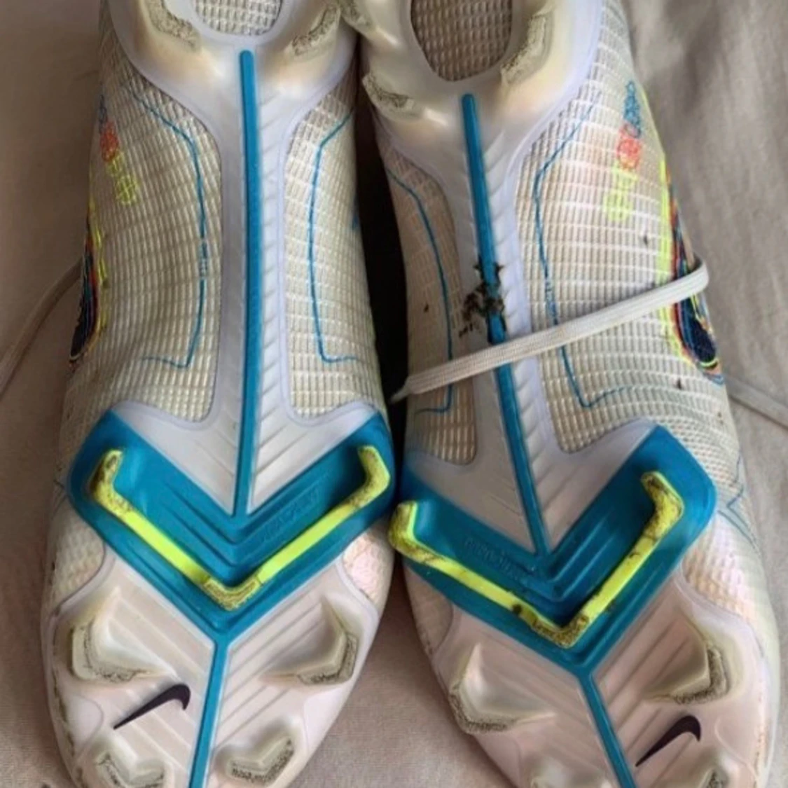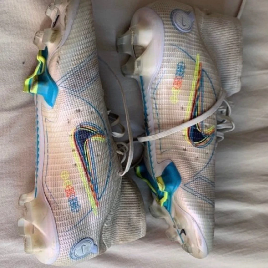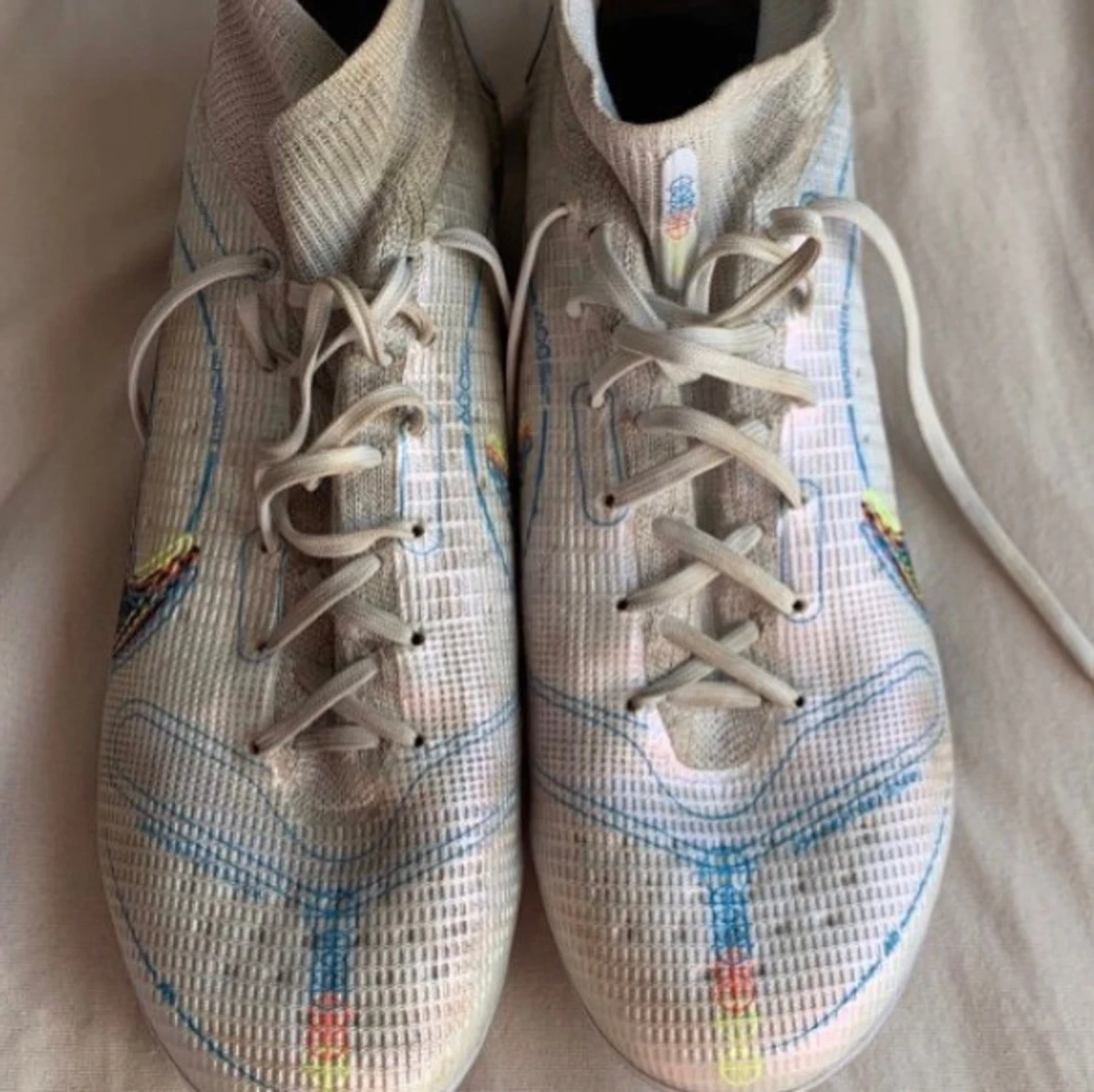 Säljer ett par Nike fotbollsskor i vitt med coola färgglada detaljer. Skorna har en tight passform och är perfekta för fotbollsträning. De har snörning och en stickad del vid ankeln för extra stöd. Sulan har en grym design med blå och gula inslag.