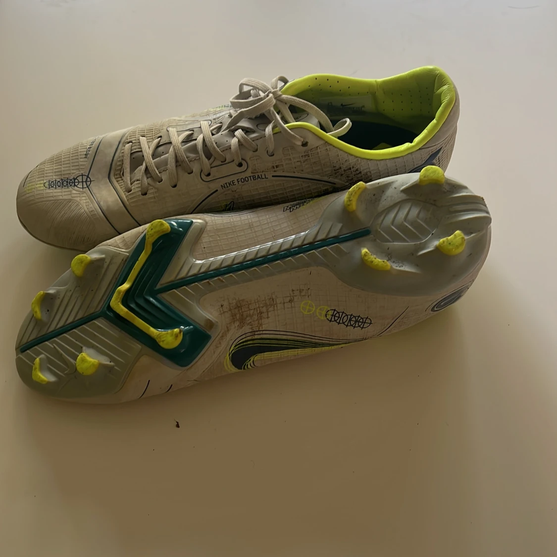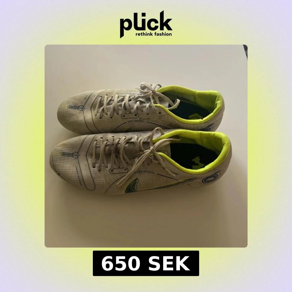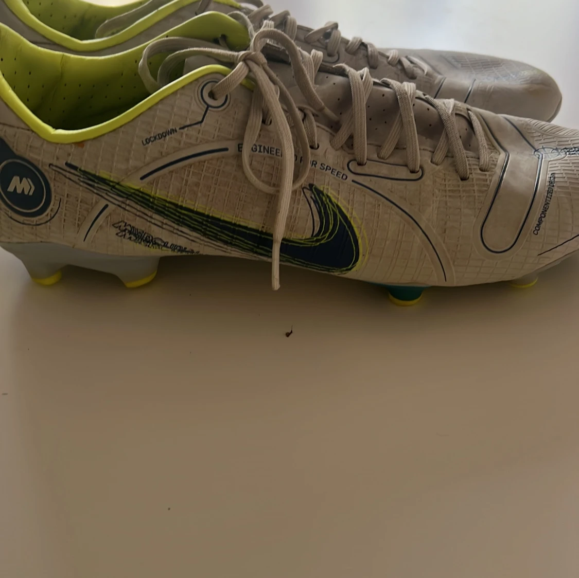 Snygga fotbollsskor från Nike i vitt med detaljer i neongult och mörkblått. Skorna har snörning, rund tå och platt sula med dobbar för bra grepp på planen. Insidan är fodrad i neongult och ovandelen är i syntetmaterial. Perfekta för dig som vill sticka ut på fotbollsplanen. Behöver bara tvättas sen är dom som nya.