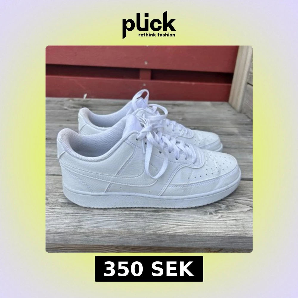 Säljer ett par klassiska Nike Air sneakers i helvitt skinn. Skorna har lågt skaft, rund tå, snörning och perforerade detaljer på tån för extra ventilation. Perfekta för dig som gillar en clean och tidlös look. Använda 2 ggr.