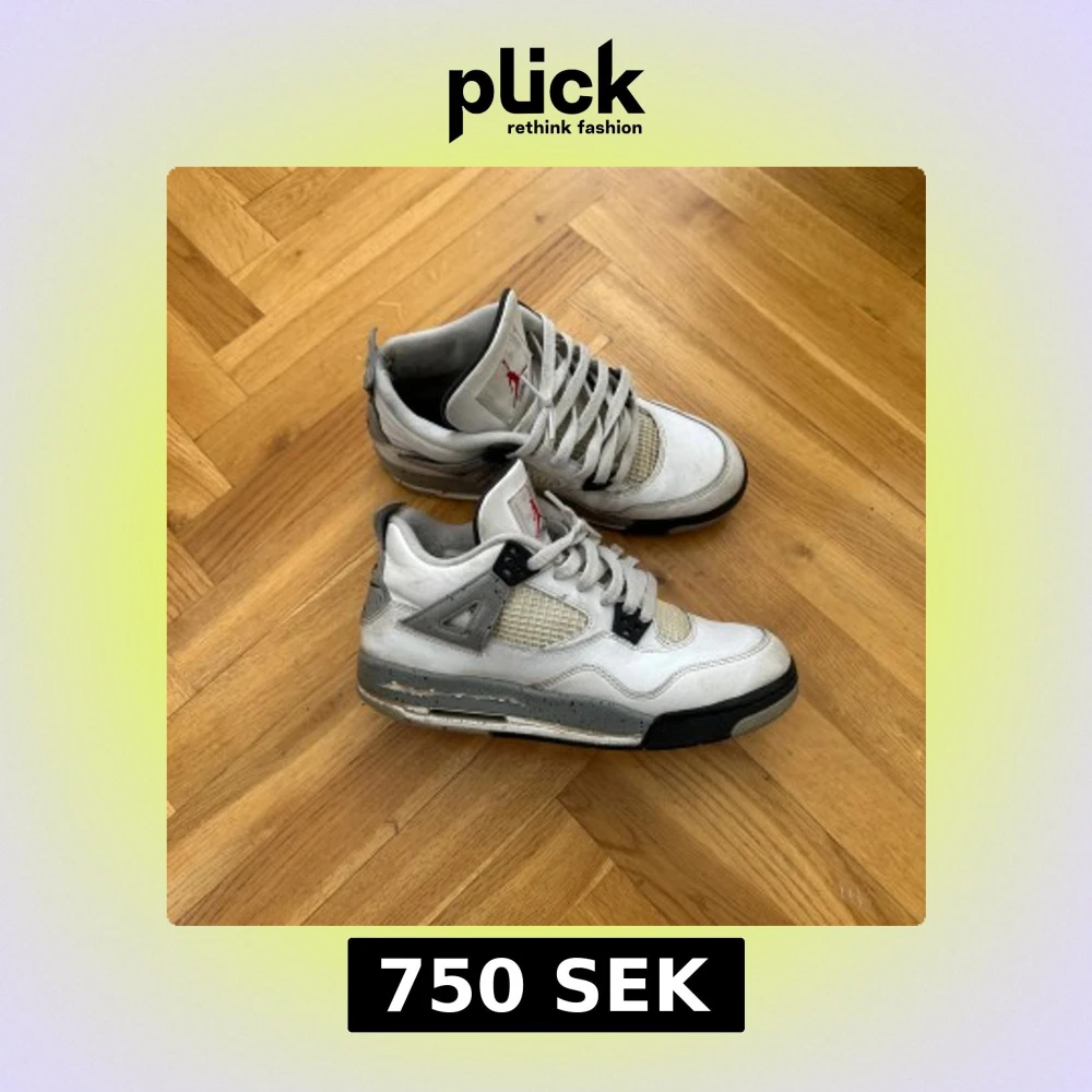 Säljer ett par klassiska Nike Air Jordan 4 Retro White Cement. Skorna är vita med grå och svarta detaljer, meshpaneler på sidorna och röd Jumpman-logga på plösen. Perfekta för dig som gillar streetwear och sneakers med ikonisk design.