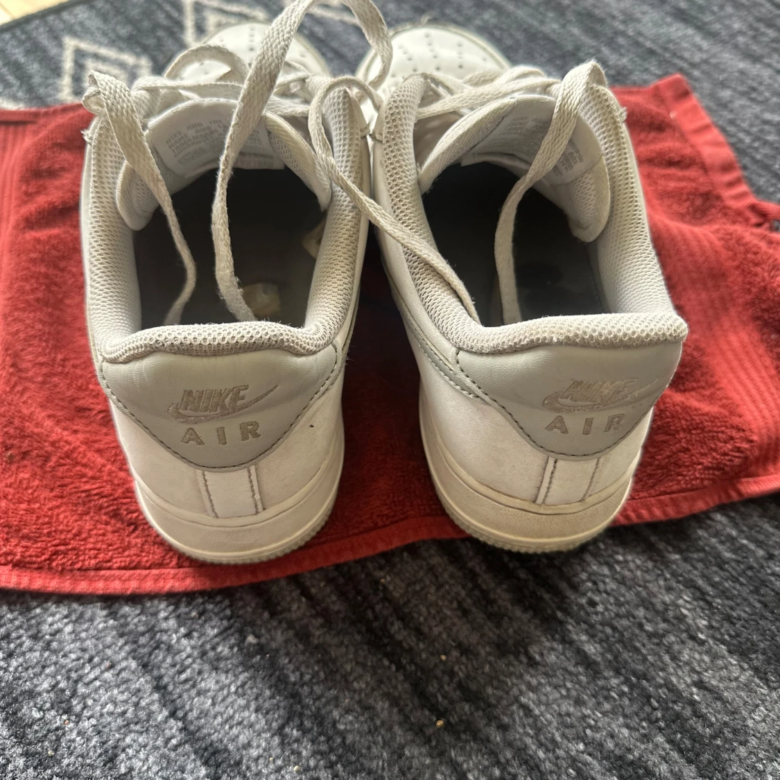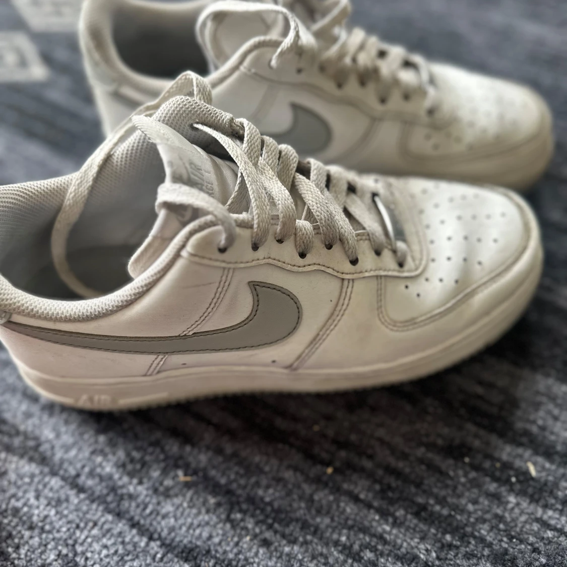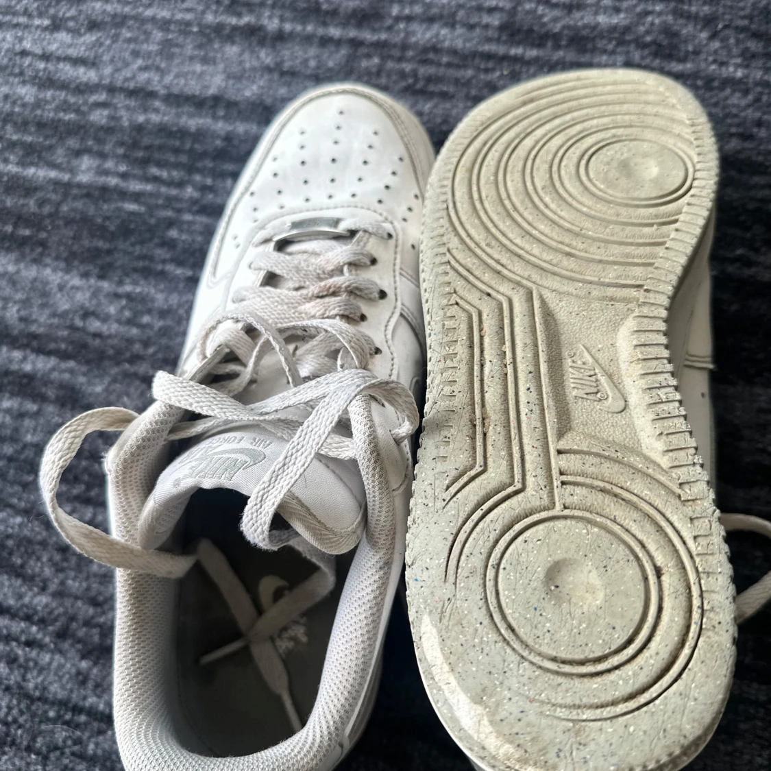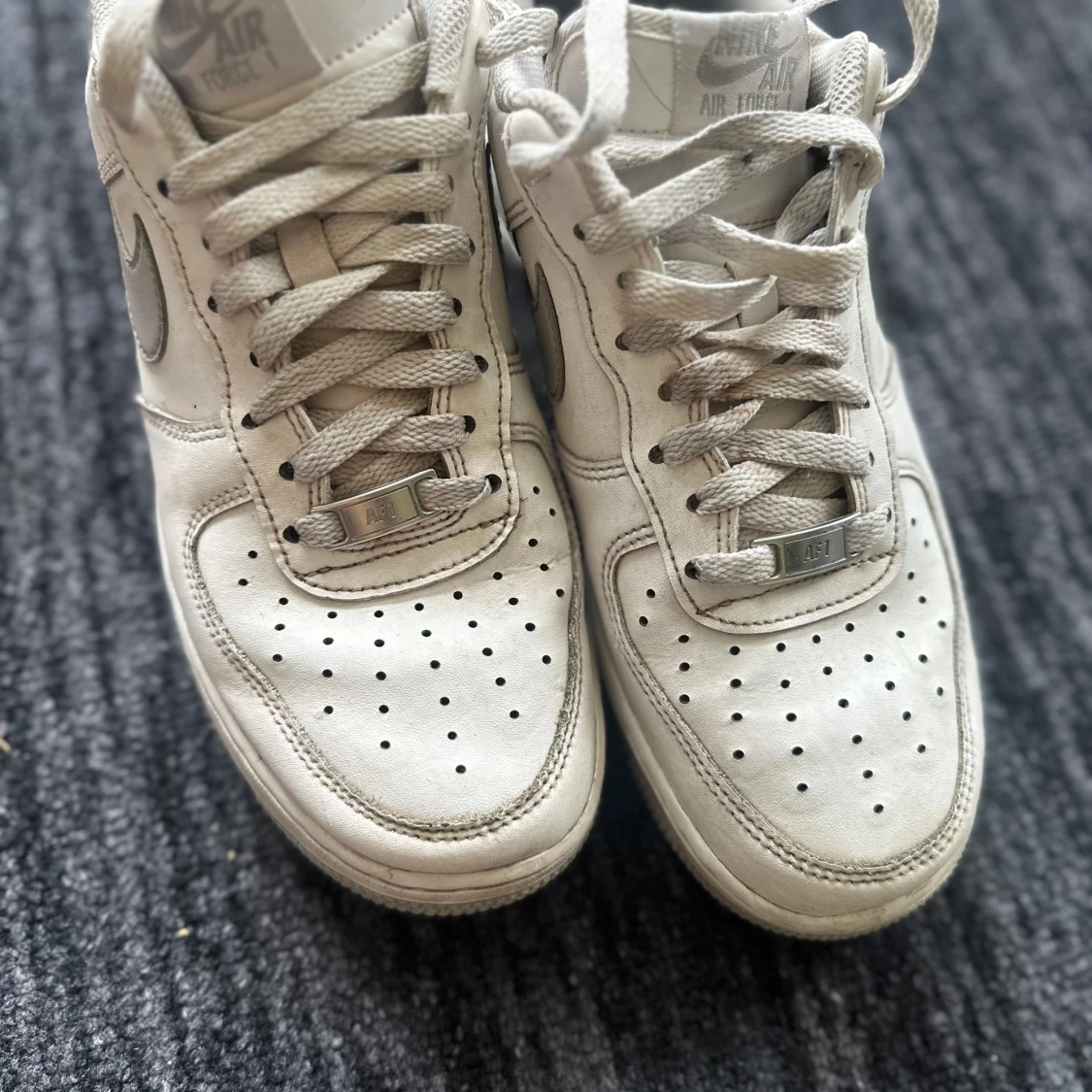 Klassiska vita Nike Air Force 1 sneakers med rund tå och platt sula. Skorna har snörning och är tillverkade i skinn med perforerade detaljer på tån för extra ventilation. Swoosh-logga på sidan och diskret branding på plösen.