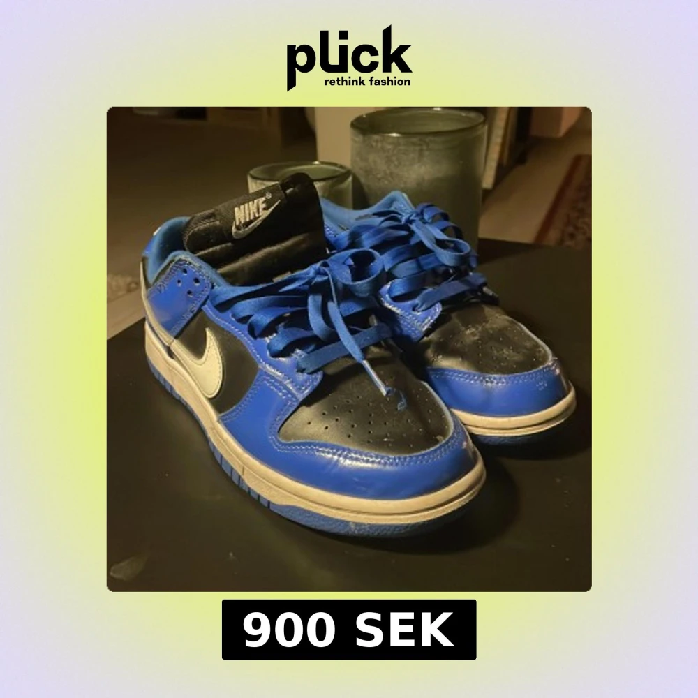 Snygga Nike Dunk sneakers i en fräsch kombination av blått och svart. Skorna har en klassisk design med snörning och en vit sula som kontrasterar snyggt mot de mörka färgerna. Perfekta för en stilren look.