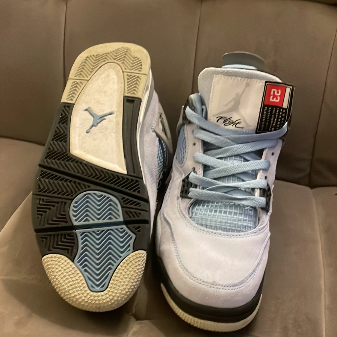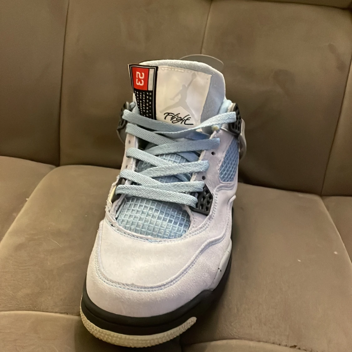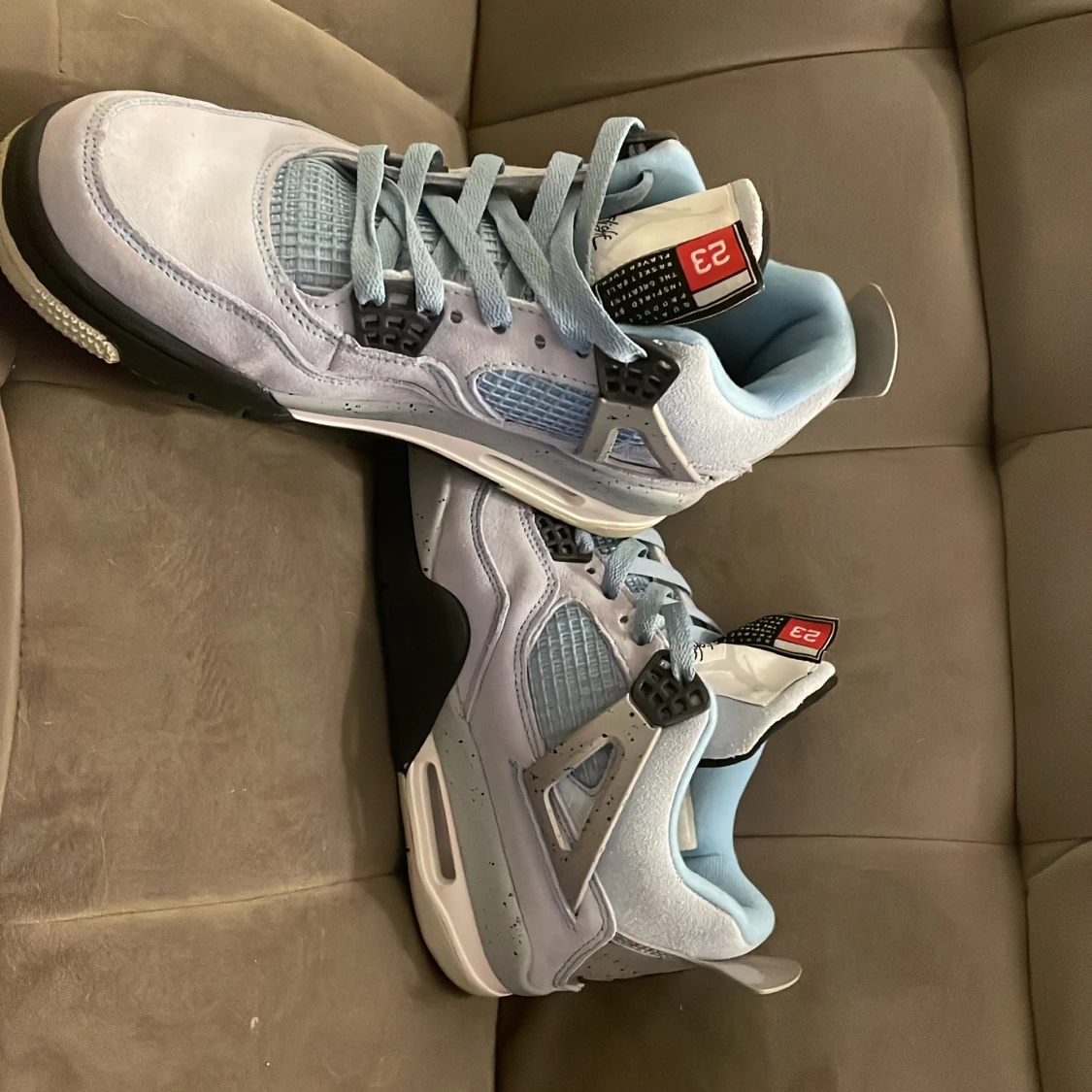Säljer ett par Nike Air Jordan 4 University Blue med ljusblå mocka, svarta och grå detaljer samt meshpaneler. Skorna har snörning, rund tå och en tydlig Jumpman-logga på hälen. Perfekta för dig som gillar sneakers med unik färg och stil.