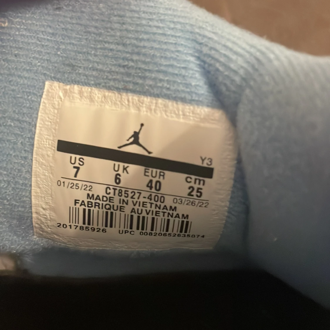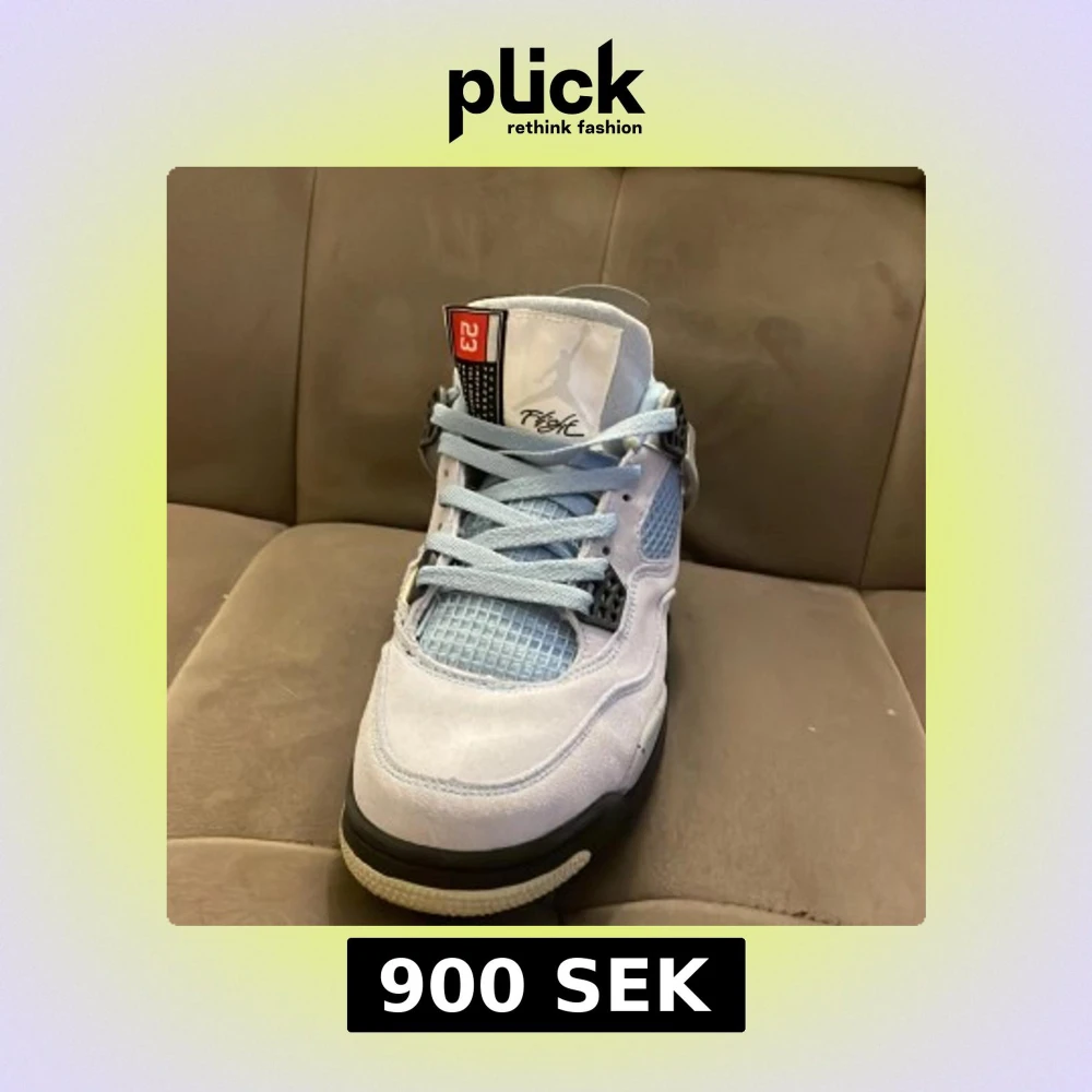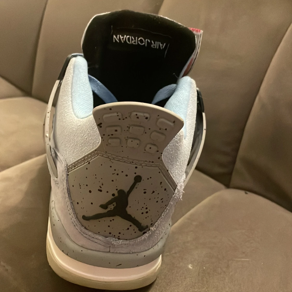 Säljer ett par Nike Air Jordan 4 University Blue med ljusblå mocka, svarta och grå detaljer samt meshpaneler. Skorna har snörning, rund tå och en tydlig Jumpman-logga på hälen. Perfekta för dig som gillar sneakers med unik färg och stil.