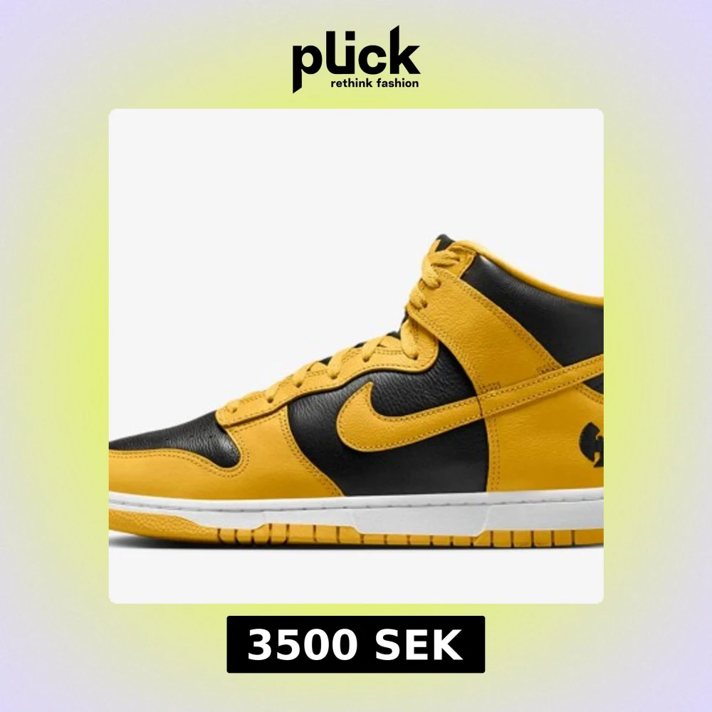 Nike Dunk High wu tang i svart och gul med vit sula. Skorna har klassisk dunk-design med snörning och tydlig Nike swoosh på sidan. Tillverkade i skinn med kontrasterande färgblock och platt sula.