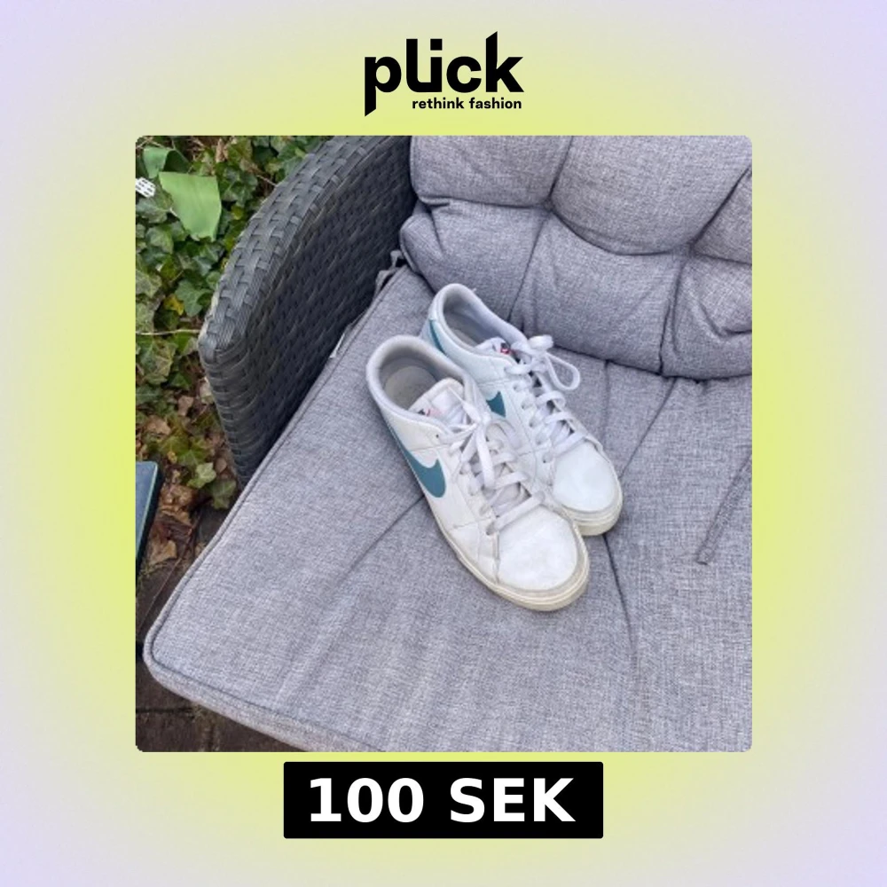 Säljer ett par vita Nike sneakers med blå swoosh och snörning. Perfekta för en avslappnad stil. Skorna har en klassisk design med rund tå och vit sula.