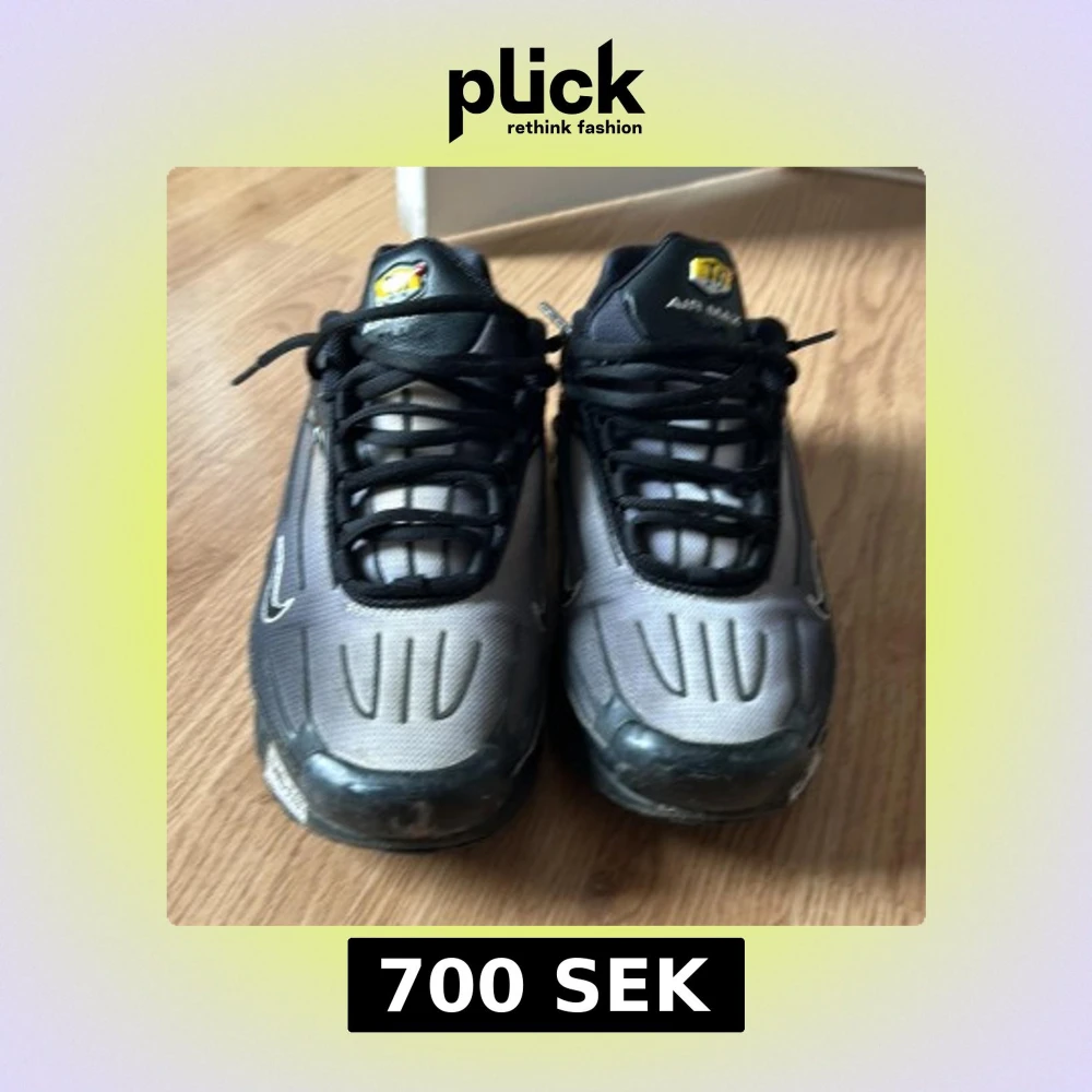 Snygga Nike Air Max sneakers i svart och grått med klassisk snörning. Skorna har en futuristisk design med Tuned Air-dämpning och tydliga detaljer på hälen. Perfekta för en sportig look.