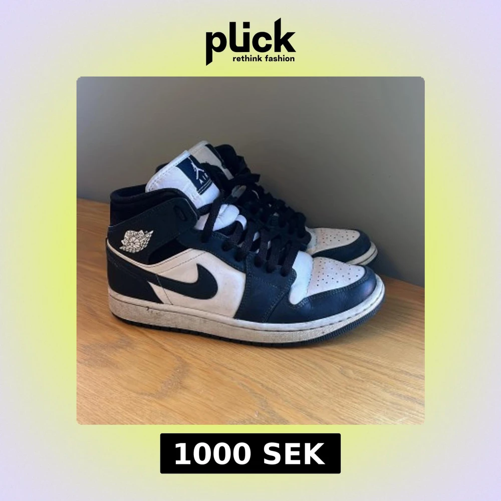 Säljer ett par Nike Air Jordan 1 Mid i svart och vitt skinn. Klassisk high-top modell med svart swoosh och vita paneler, samt svart snörning. Perfekta för dig som gillar streetwear och vill ha en ikonisk sneaker i garderoben. Ingår ingen låda