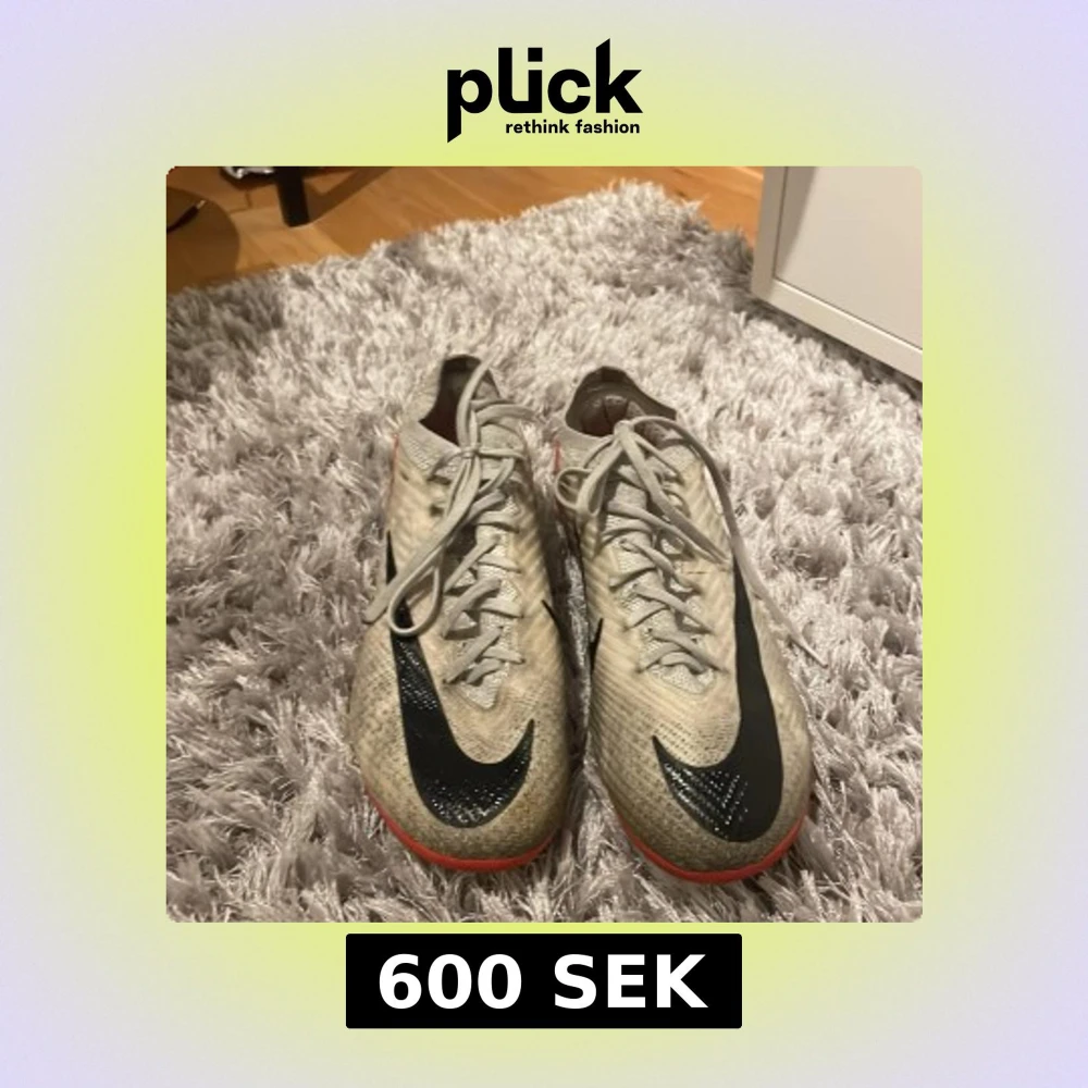 Säljer ett par Nike fotbollsskor i beige med svarta och röda detaljer. Skorna har snörning och en sportig design, perfekt för fotbollsplanen. De är i storlek herr 41 och har en stilren look med det klassiska Nike-märket på sidan. De har inte gått upp någonstans och påse kommer med.