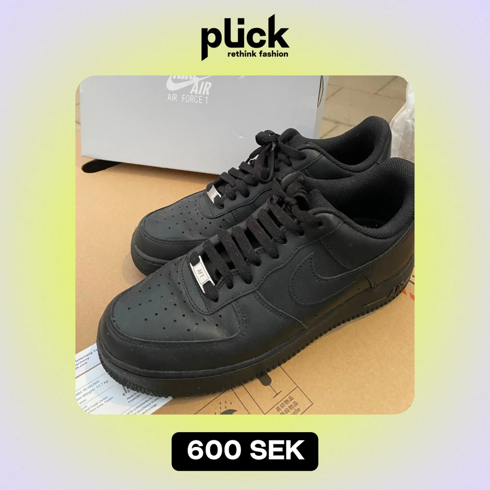 Säljer ett par klassiska svarta Nike Air Force 1 '07 i storlek 42.5. Skorna är i nytt skick och har en stilren design med snörning och perforerade detaljer för extra ventilation. Köpta för 1 395kr. Perfekta för både vardag och fest!