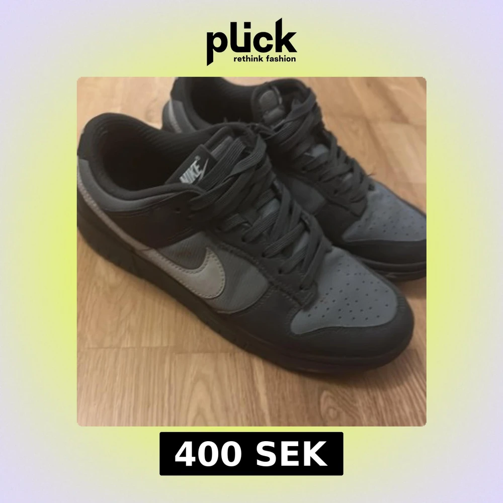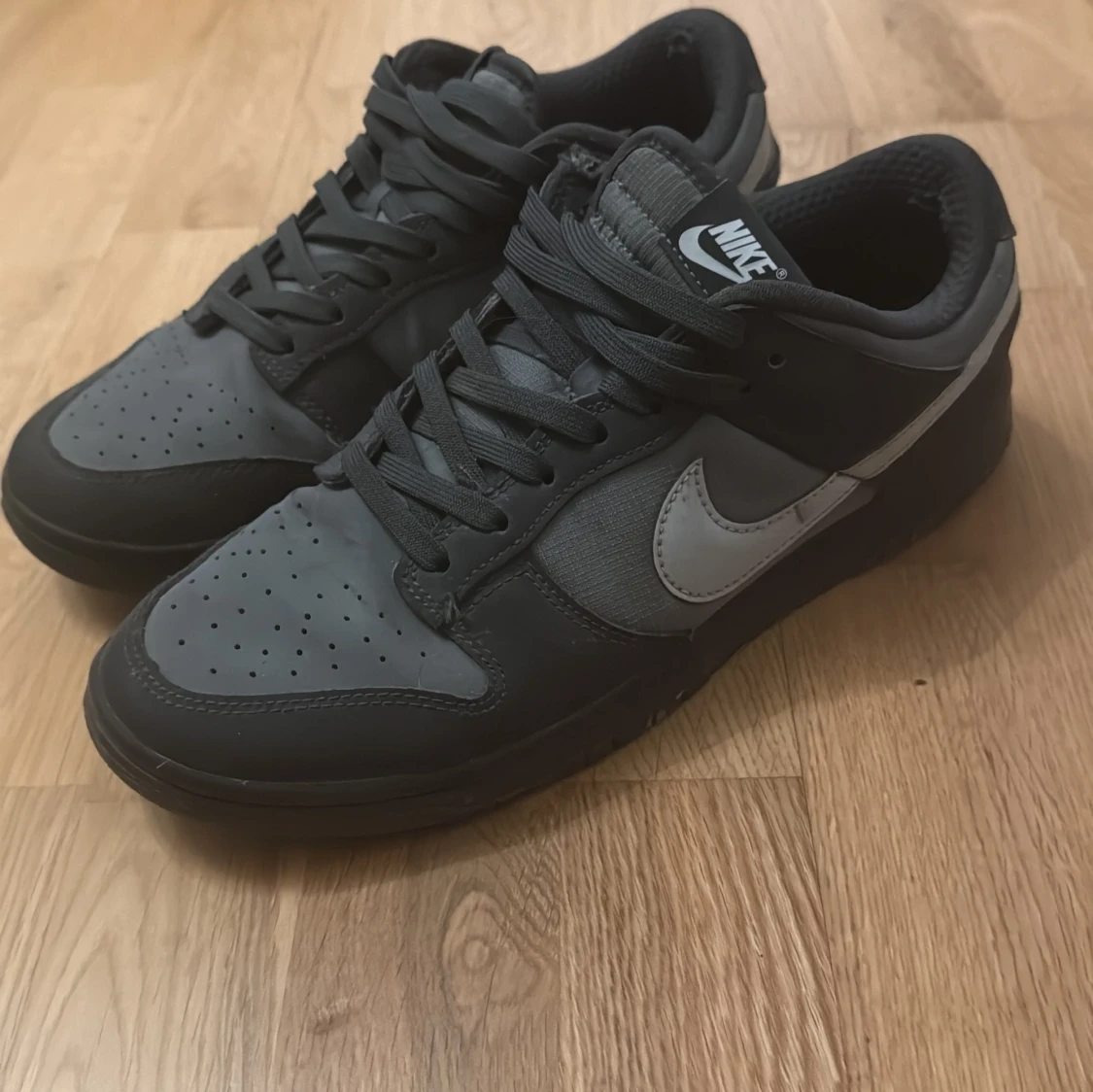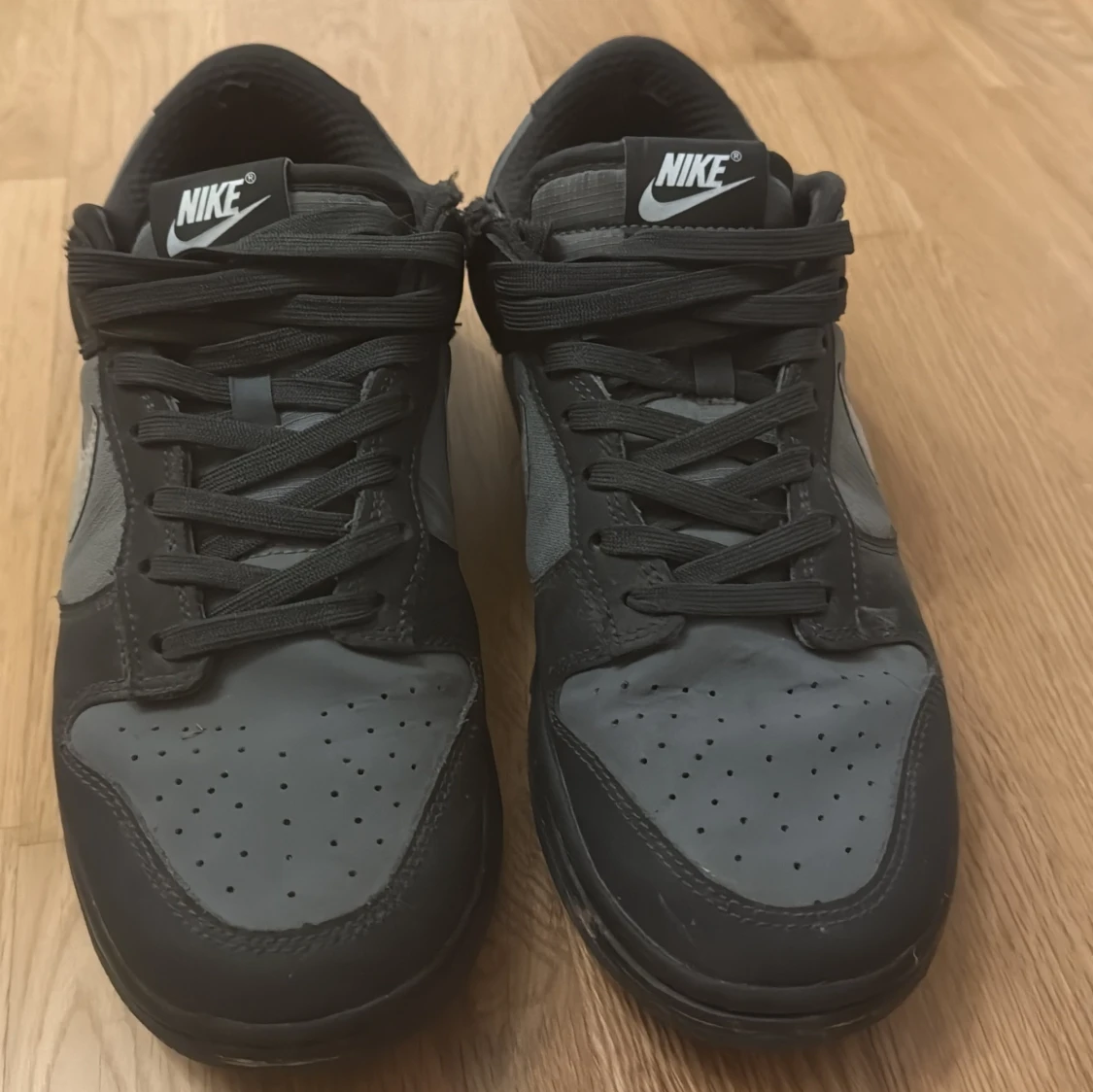 Säljer ett par stilrena Nike sneakers i svart och grått. Skorna har en klassisk design med snörning och perforerade detaljer på tån för extra ventilation. Perfekta för både vardag och träning.