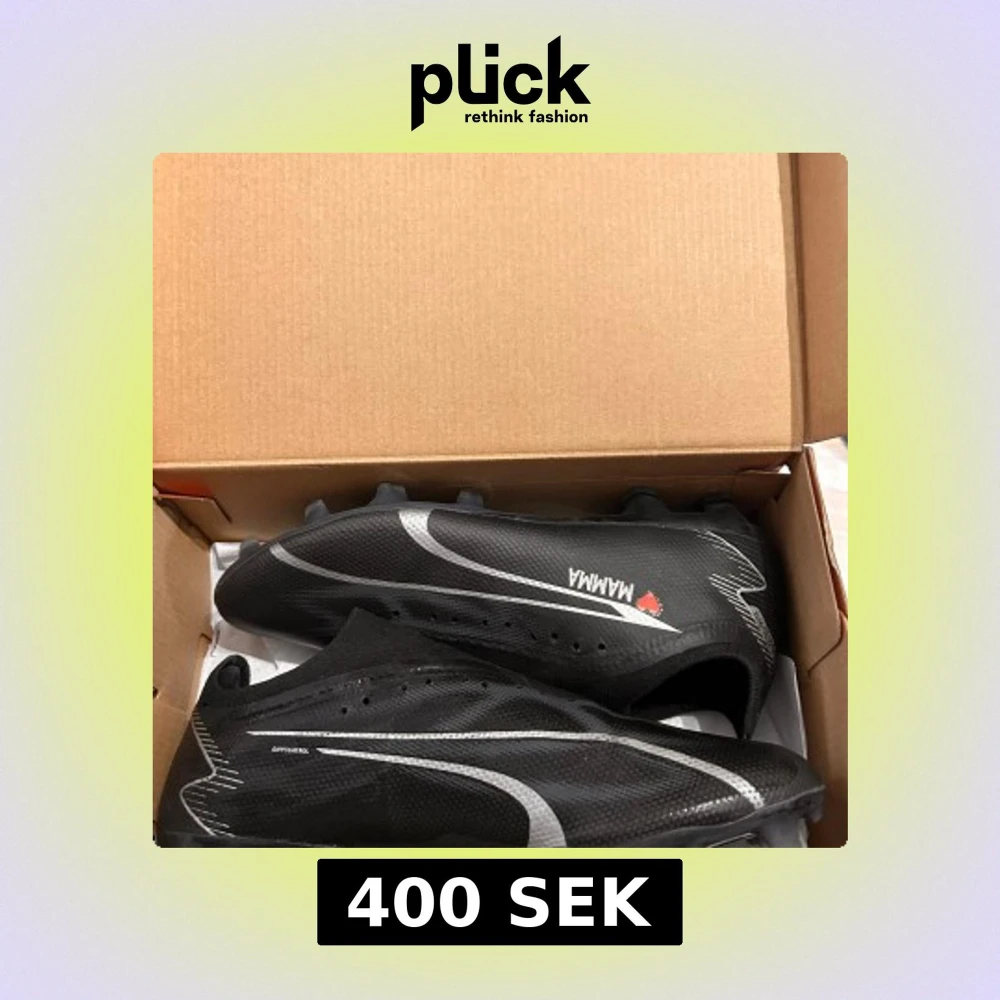 Säljer ett par svarta Nike fotbollsskor med silverfärgade detaljer och texten 'MAMMA❤️' med ett hjärta på sidan. Skorna har snörningsfri design och dobbar för spel på gräs/konstgräs. Perfekta för dig som vill sticka ut på planen.