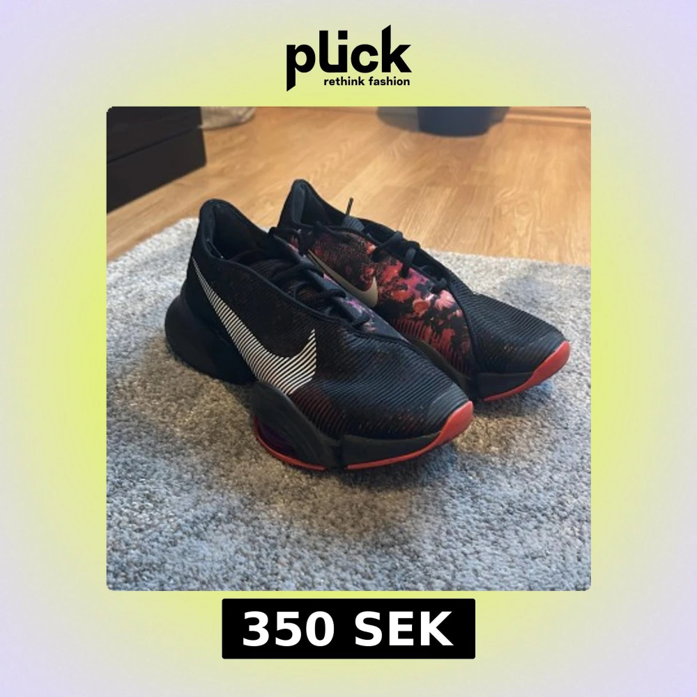 Säljer ett par unika Nike sneakers med svart bas, röda och lila detaljer samt vit swoosh. Ena skon har ett mönster med röda och rosa inslag. Skorna har snörning och en futuristisk sula med tydliga färgblock. Perfekta för dig som vill sticka ut.