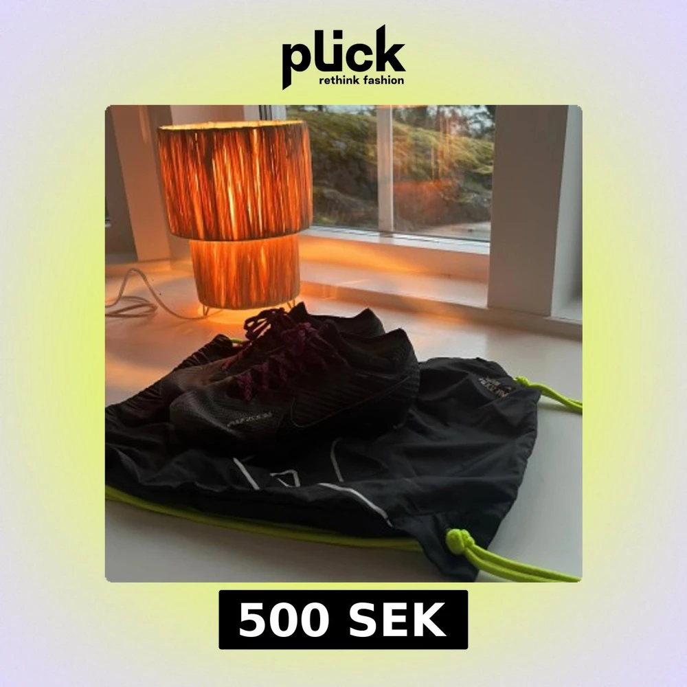 Säljer ett par svarta Nike fotbollsskor med lila snörning och gröna detaljer på insidan. Skorna har rund tå och platt sula med dobbar, perfekta för spel på gräs. Kommer med tillhörande svart förvaringspåse med neongula snören.