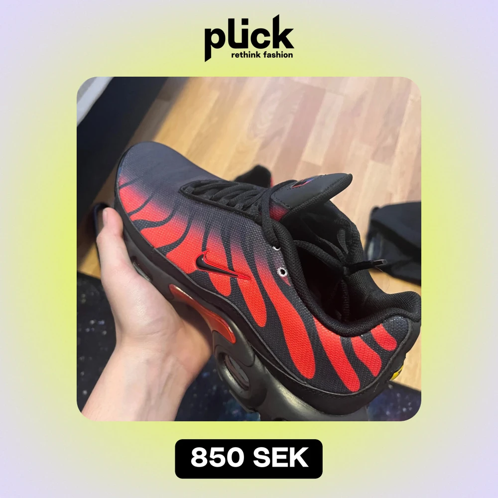 Säljer ett par snygga Nike sneakers i svart och röd med coolt mönster. Skorna har en modern design med snörning och en bekväm passform. Perfekta för både vardag och träning. De är i mycket bra skick och redo för nya äventyr!