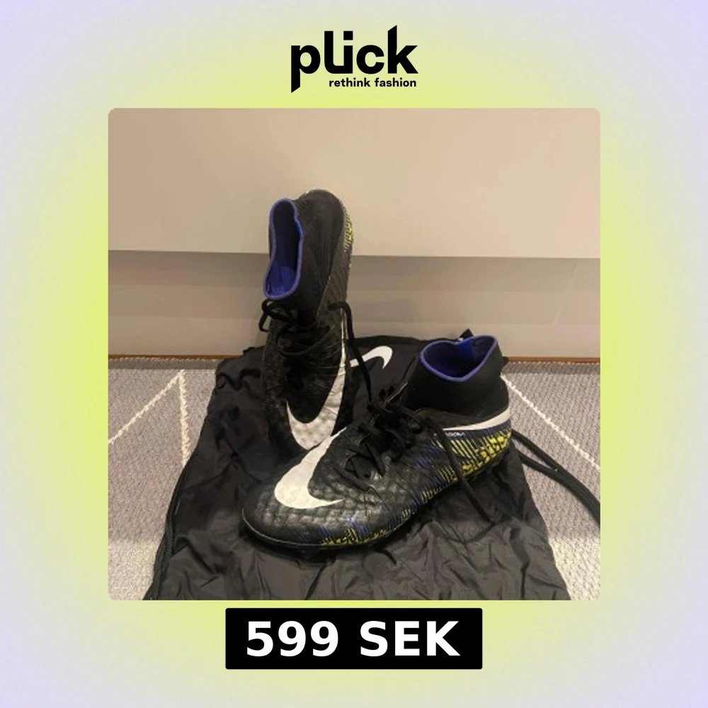 Snygga fotbollsskor från Nike i svart med gula, blåa och vita detaljer. Skorna har en hög ankelkrage och snörning för bra passform. Sulan har ett iögonfallande gult mönster med dobbar för optimalt grepp på planen. Inga hål eller separationer.