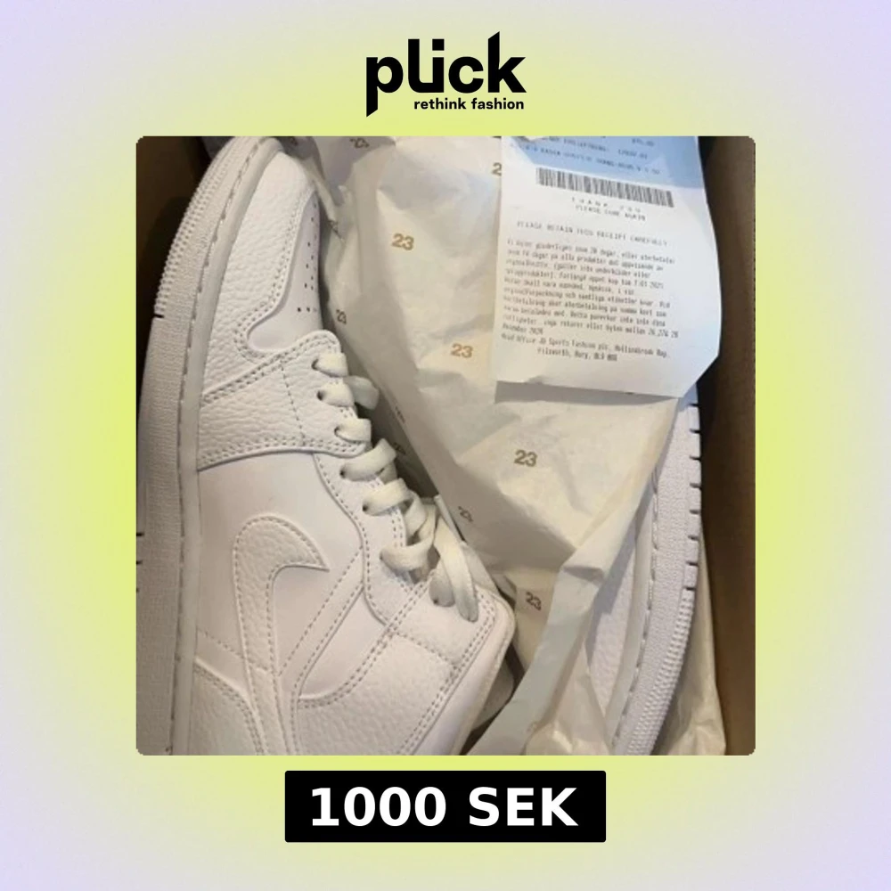 Säljer ett par fräscha och helt oanvända Nike Jordan 1 sneakers i helvitt skinn med snygga detaljer och klassisk snörning. Modellen har en rund tå och platt sula, perfekt för dig som gillar stilrena och ikoniska sneakers. Levereras i originalkartong med papper.