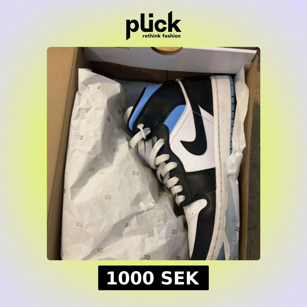 Nike Jordan 1 sneakers i svart, vitt och ljusblått skinn. Klassisk high-top modell med vit snörning och rund tå. Snygg kontrast mellan färgerna och ikonisk Swoosh-logga på sidan. Perfekt för dig som vill ha streetstyle med edge.