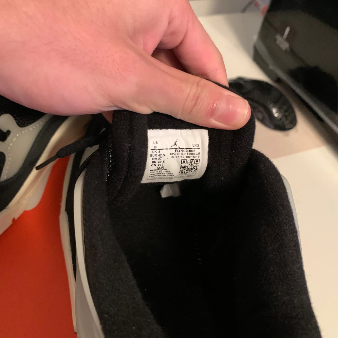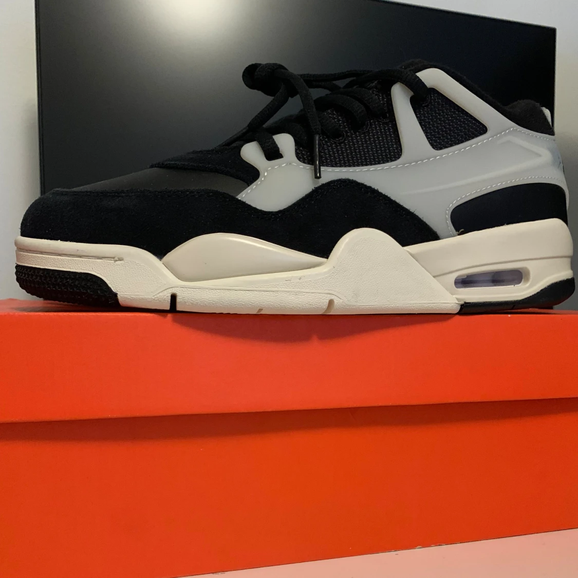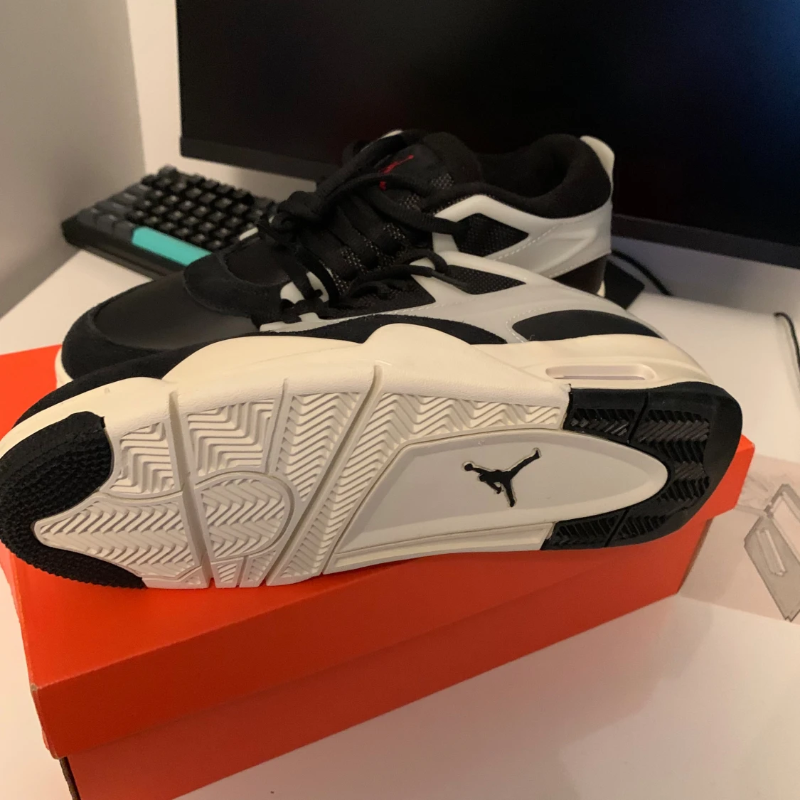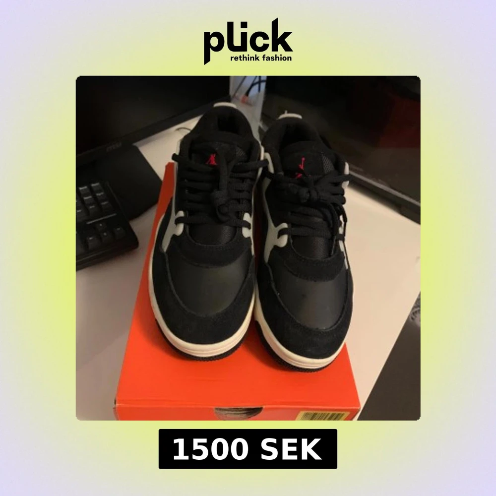 Säljer ett par feta Nike Jordan 4 RM sneakers i svart och vitt med röda detaljer. Skorna har en chunky sula, snörning och coola paneler i mocka och syntet. Perfekta för dig som vill sticka ut med en klassisk streetwear-look.