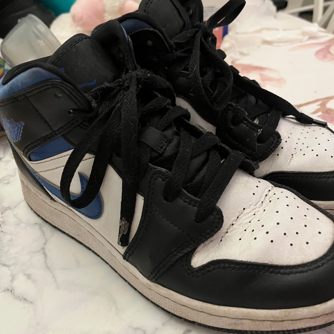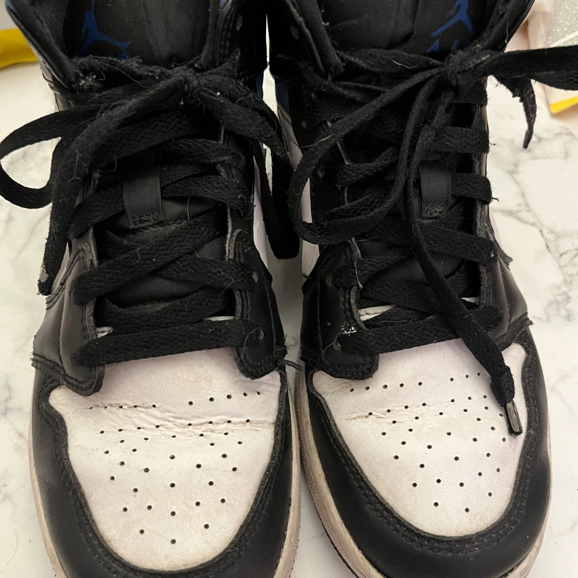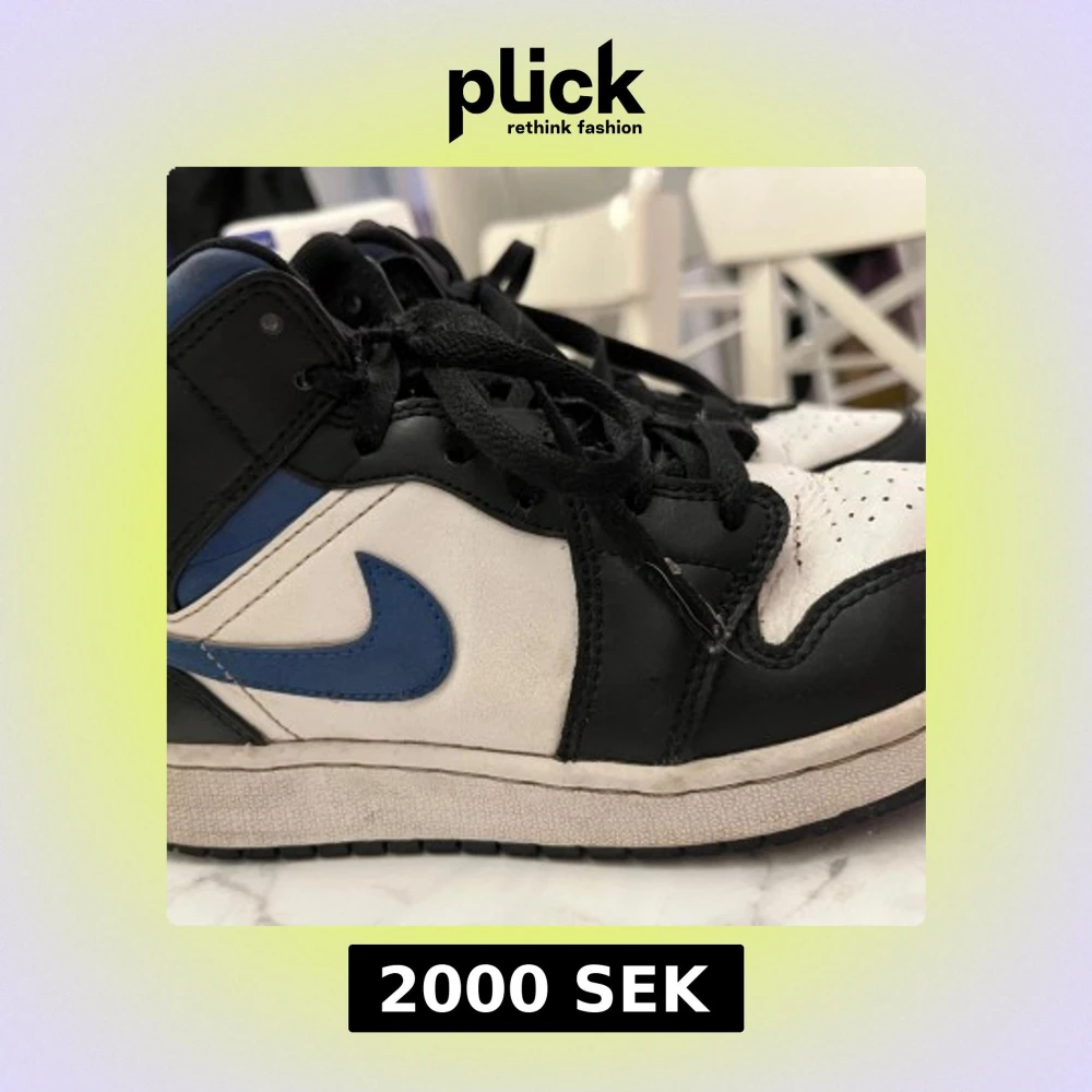 Säljer nu mina fina Snygga Nike Air Jordan 1 sneakers i svart, vitt och blått skinn. Eftersom det är inte riktigt min stil längre ,Klassisk high-top modell med svart snörning och perforerad tå. Ikonisk blå swoosh och Jordan Wings-logga på sidan. Perfekta för dig som vill sticka ut med streetstyle.