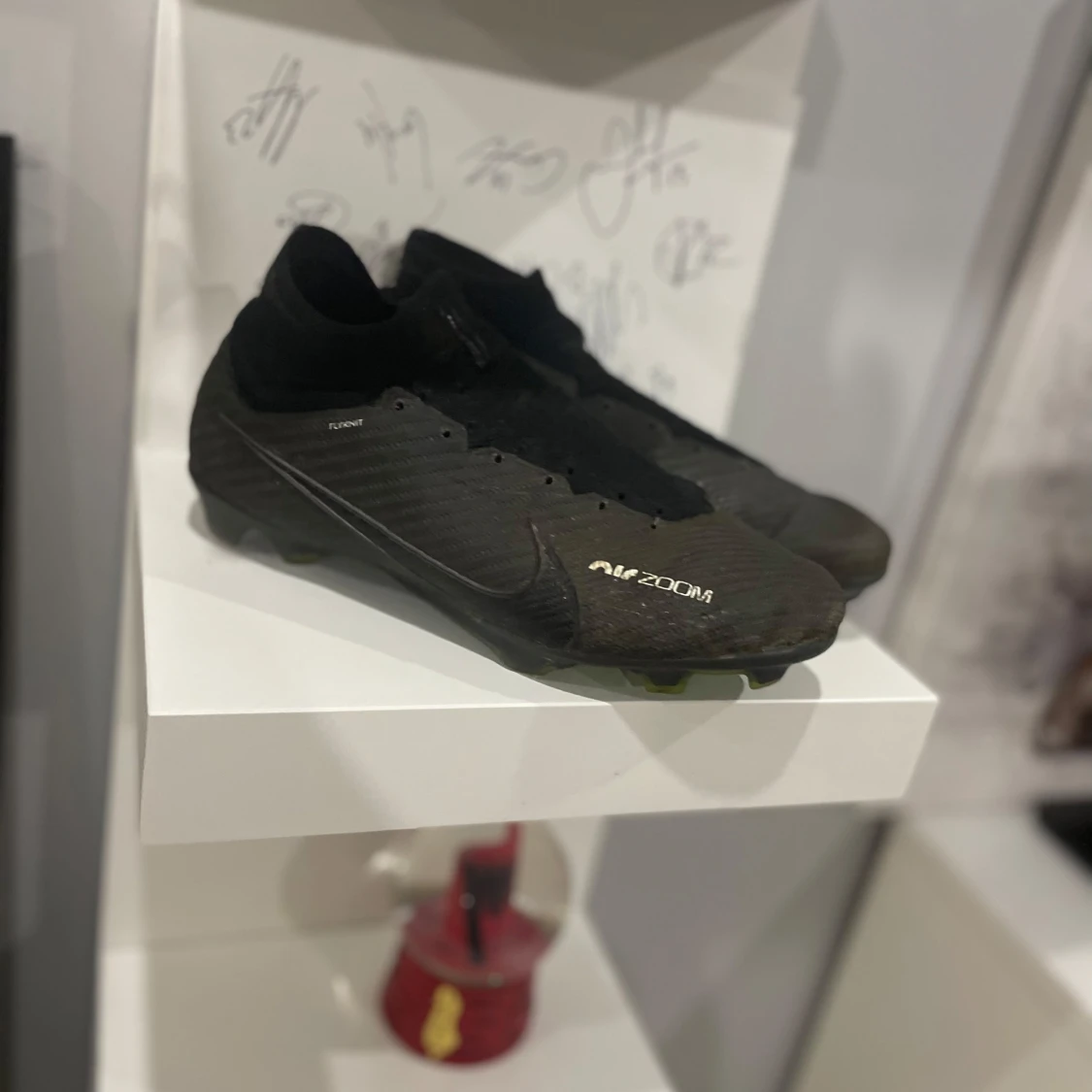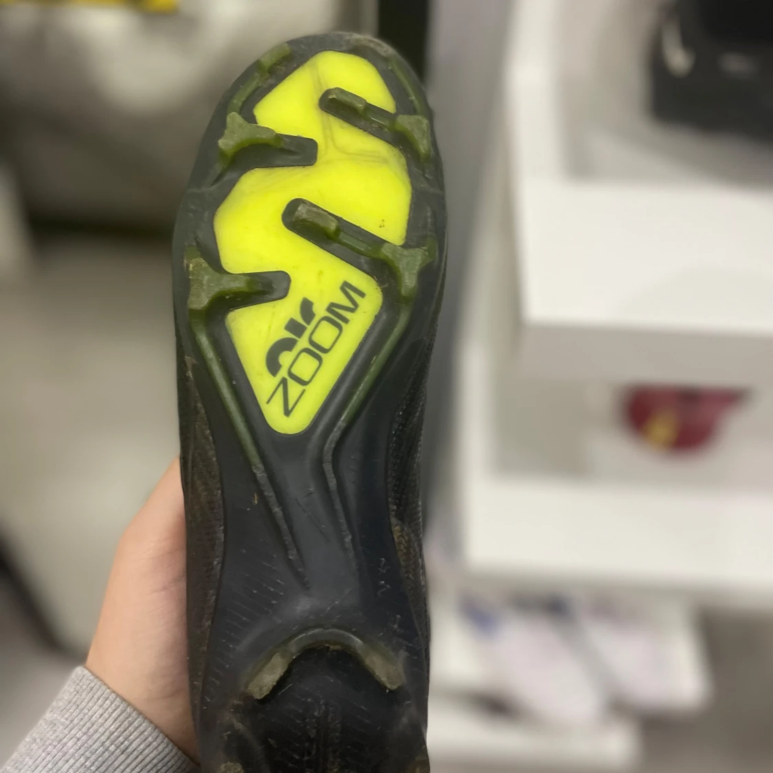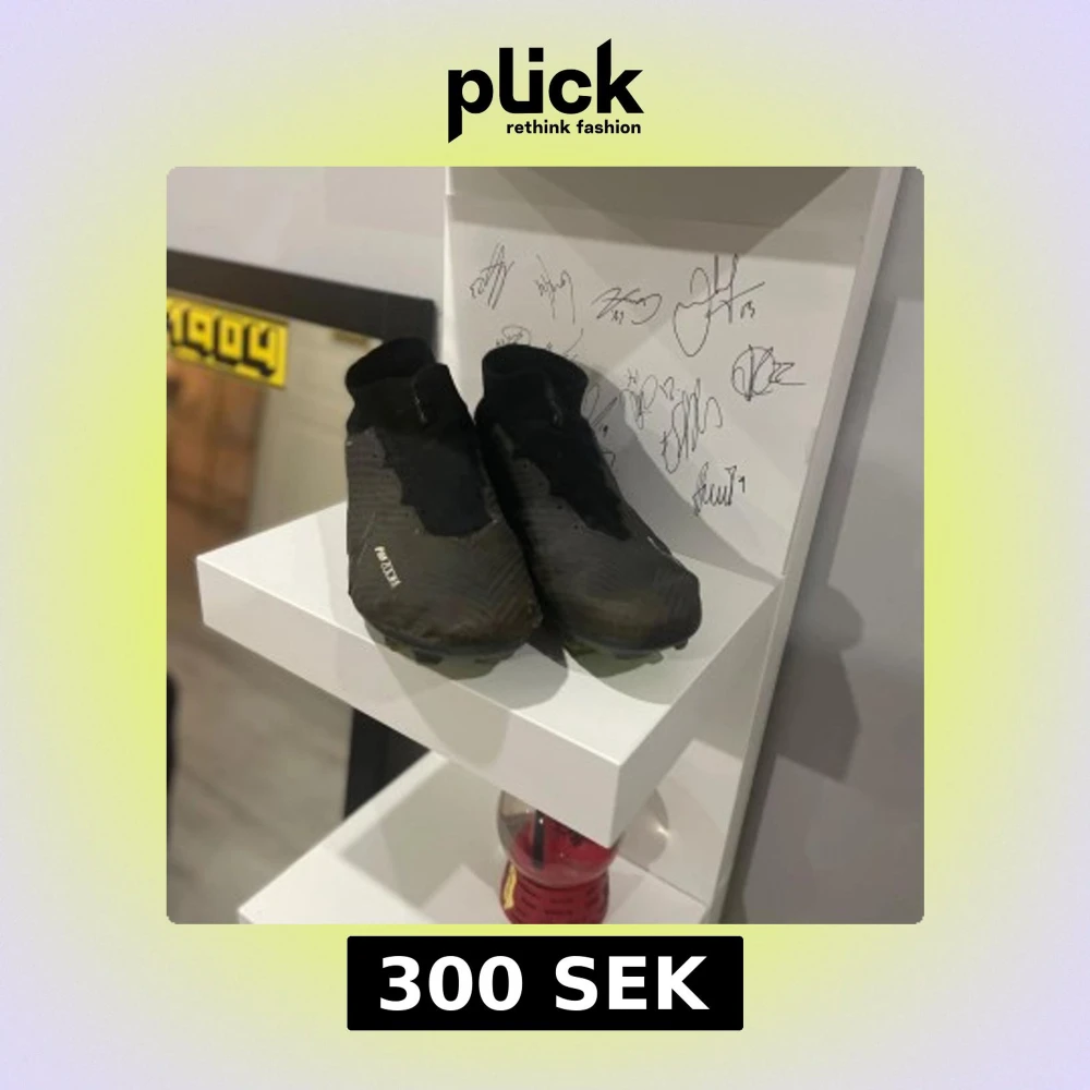 Säljer ett par svarta Nike fotbollsskor med Zoom-teknologi. Skorna har en tight passform och är designade för optimal prestanda på planen. De har en slitstark sula med dobbar för bra grepp.