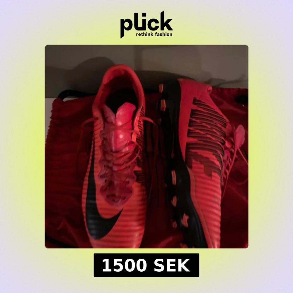 Säljer ett par Nike Mercurial fotbollsskor i rött med svarta detaljer och snörning. Skorna har en smal, sportig form och mönstrade svarta linjer på sidorna. Yttersulan är svart med röda dobbar, perfekt för dig som vill sticka ut på planen.