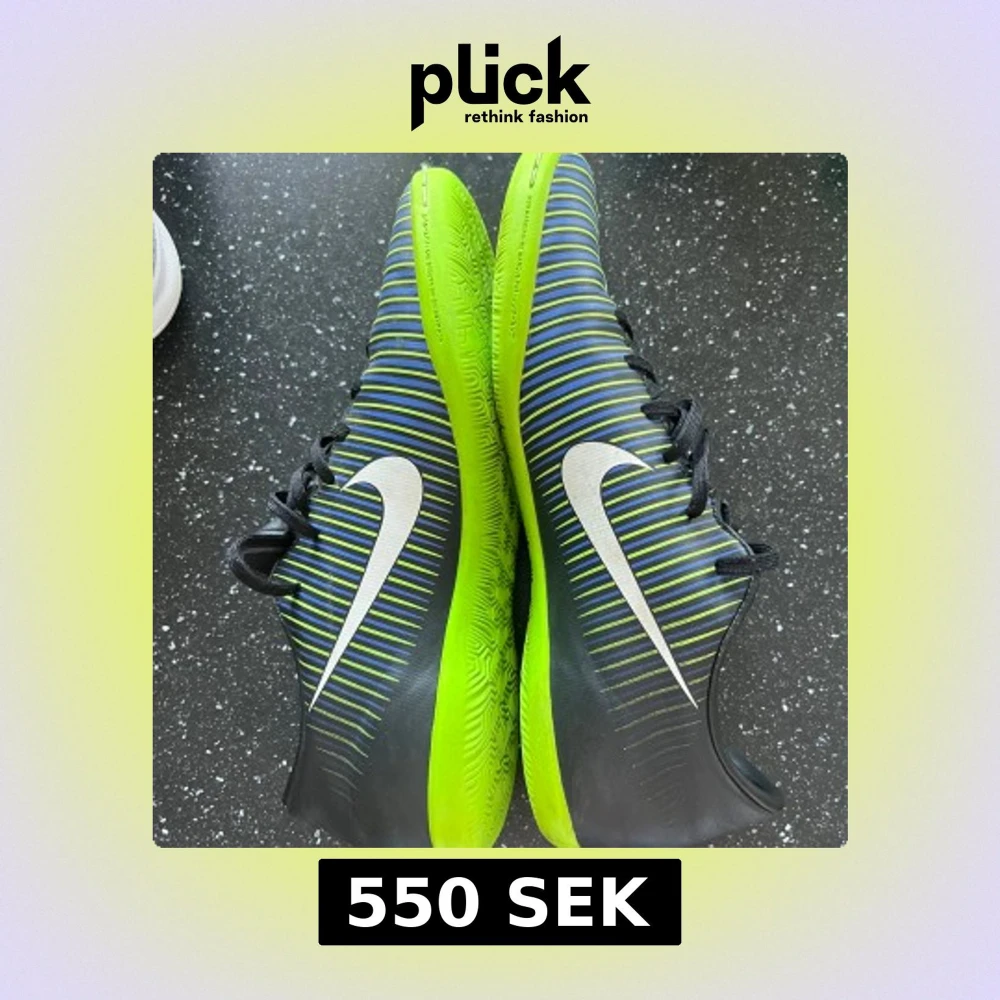 Snygga Nike Mercurial fotbollsskor i svart med gröna och blå ränder. Skorna har en vit Nike-logga och svart snörning. Perfekta för fotbollsplanen med sin greppvänliga sula.