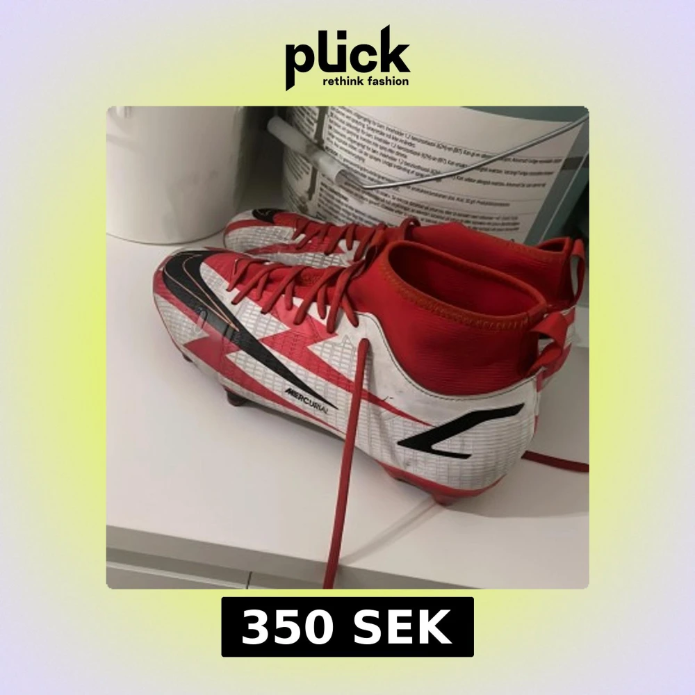 Snygga Nike Mercurial fotbollsskor i rött och vitt med svarta detaljer. Skorna har en modern design med snörning och är perfekta för fotbollsplanen. De har en CR7-logga på insidan och är gjorda i syntetmaterial för bästa prestanda.