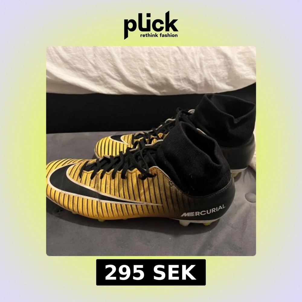 Snygga Nike Mercurial fotbollsskor i gult och svart med randigt mönster och högt strumpskaft. Skorna har snörning, platt sula med fasta dobbar och stora Nike-loggor på sidorna. Perfekta för dig som vill sticka ut på planen.
