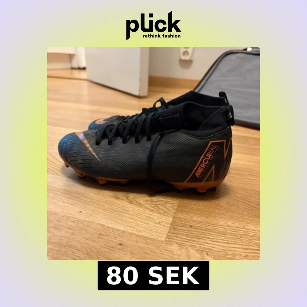 Snygga svarta Nike Mercurial fotbollsskor med orange detaljer och snörning. Perfekta för fotbollsplanen med sin strömlinjeformade design och greppvänliga dobbar. Skorna är använda men fortfarande i bra skick