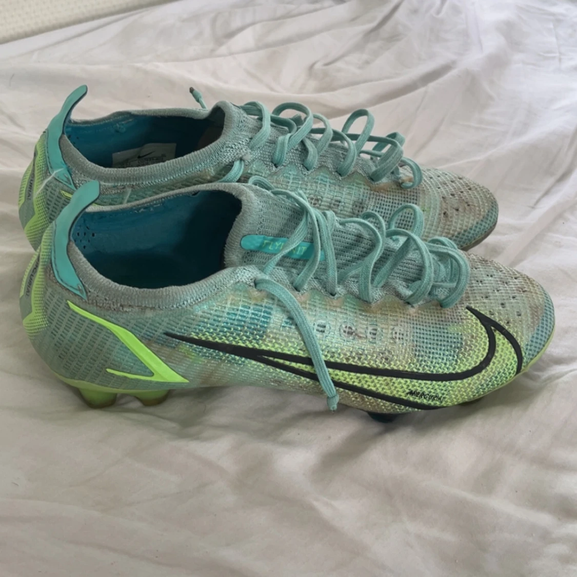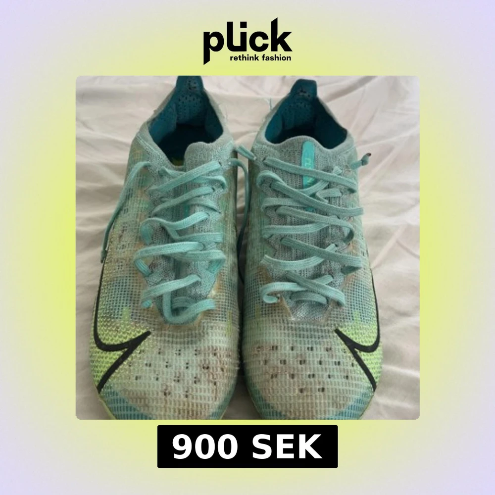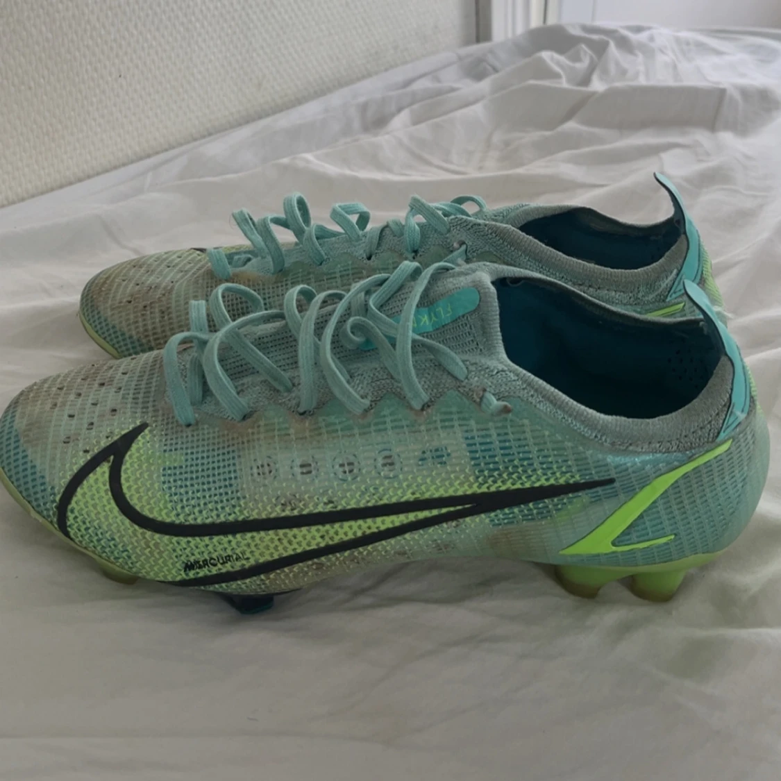 Säljer ett par Nike Mercurial fotbollsskor i turkos med svarta och neongula detaljer. Skorna har snörning, låg profil och är tillverkade i syntetmaterial med meshstruktur för bra ventilation. Perfekta för dig som vill sticka ut på planen.