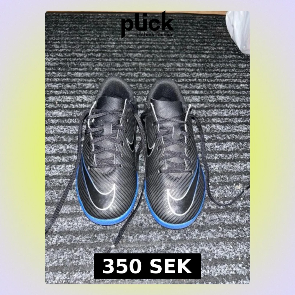 Nike Mercurial svarta futsalskor med blå sula, blåa och vita detaljer och svarta snören. De är knappt använda och är i storlek 35.