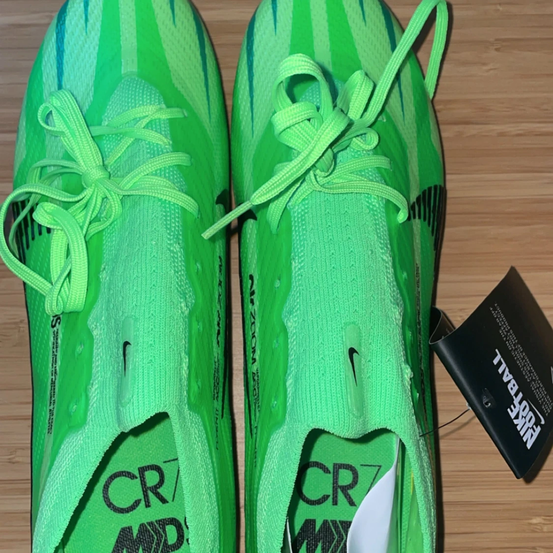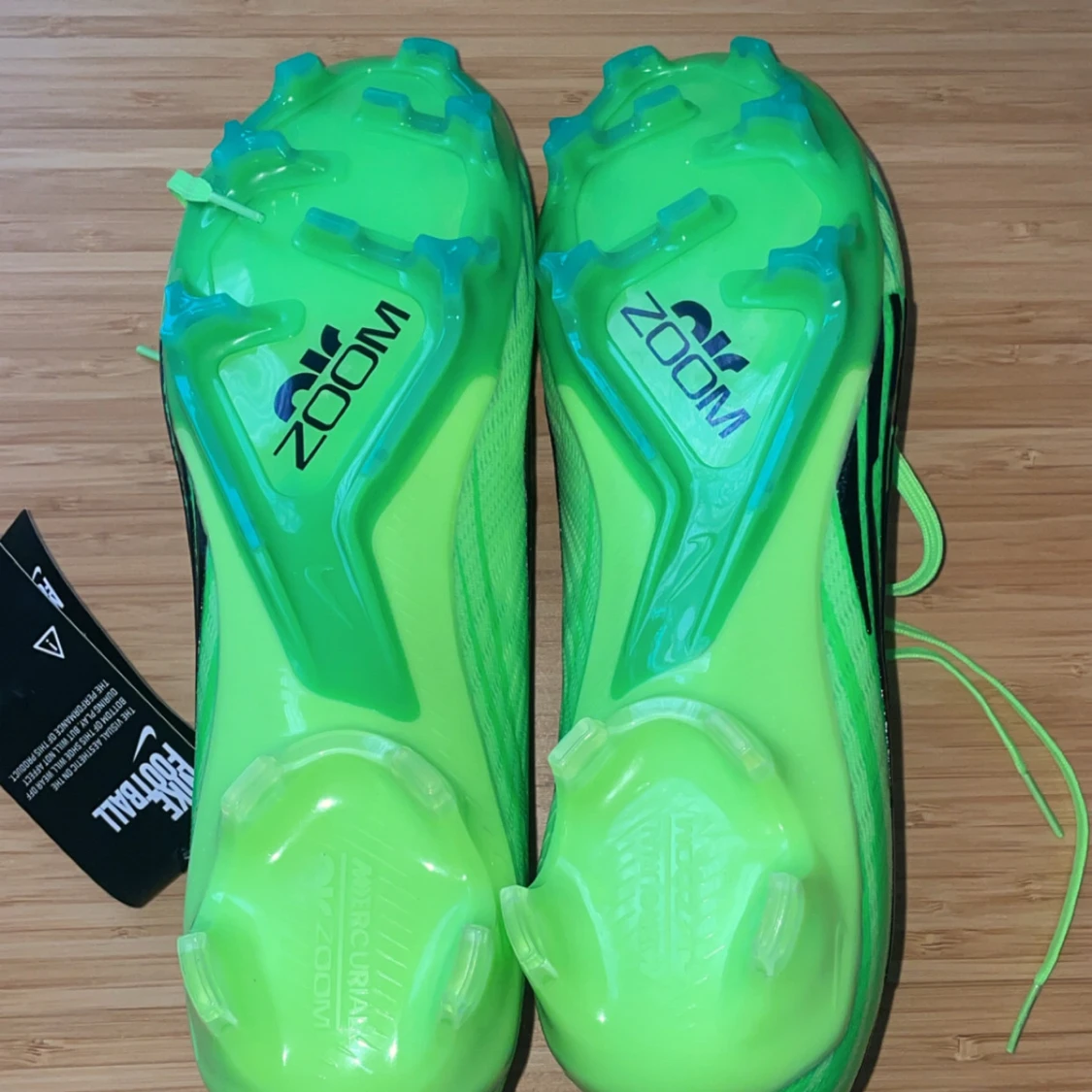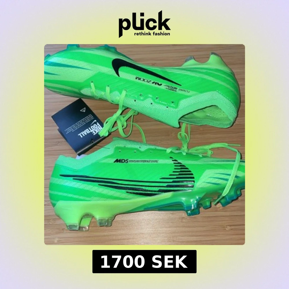 Snygga gröna Nike fotbollsskor med svarta detaljer och snörning. Skorna har en modern design med Zoom-teknologi för optimal prestanda på planen. Perfekta för fotbollsspelare som vill ha både stil och funktion.